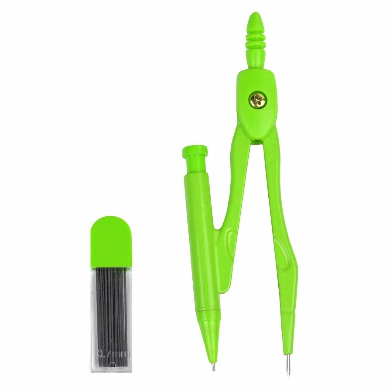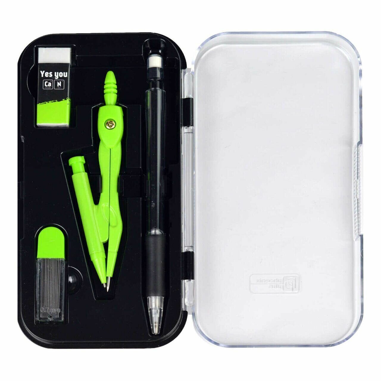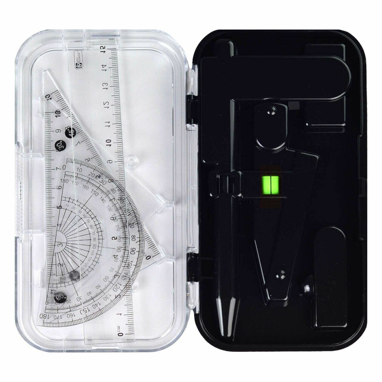 Готовальня: циркуль, сменные грифели (15 шт), механический карандаш, ластик, набор линеек ( Макс. диаметр окружности циркуля: 28,4 см, 9,1х16,9x3 см, длина циркуля- 11,7 см, шелкография в одну краску, футляр из полипропилена, картонная коробка).