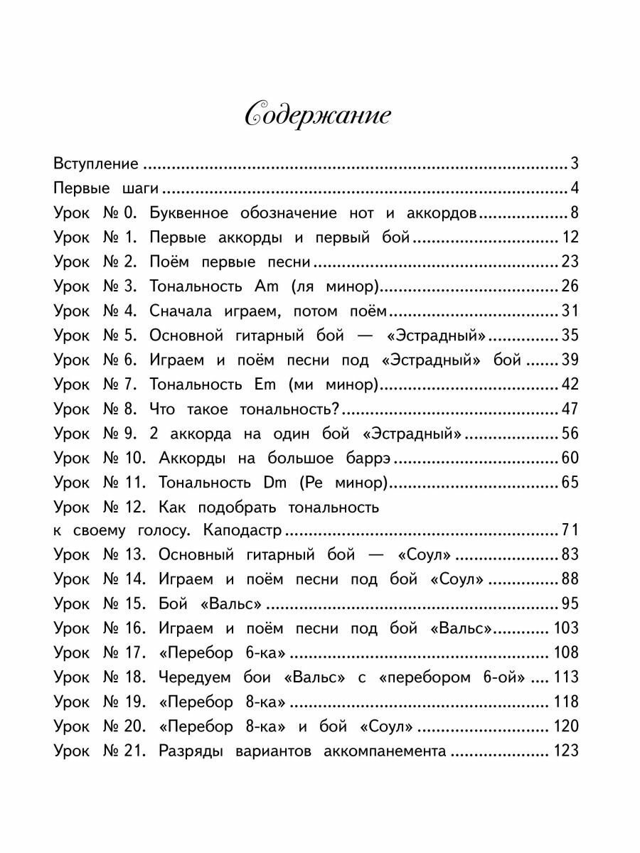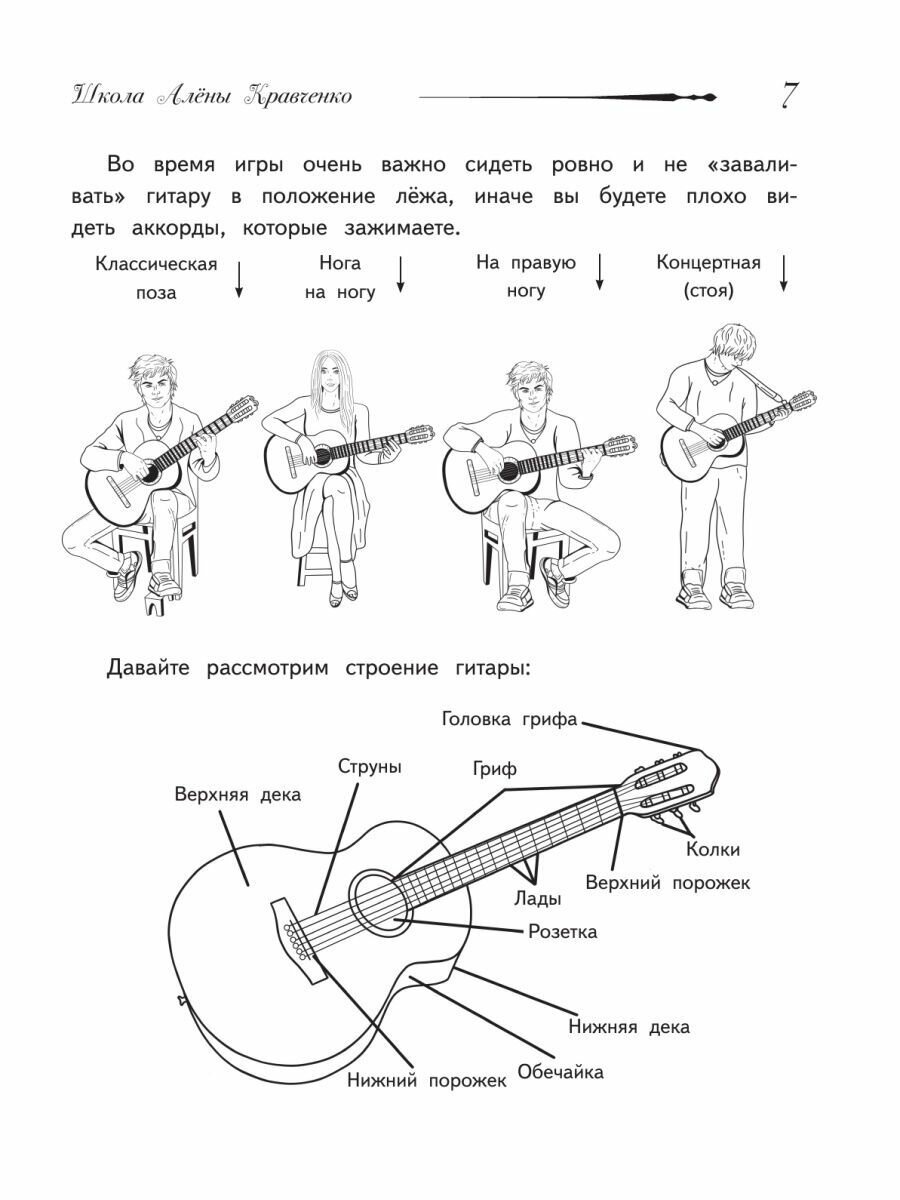 Этот самоучитель даёт возможность научиться играть и петь свои первые песни уже на втором уроке! Он подходит для всех, даже для тех, кто считает, что не обладает музыкальным слухом или голосом. Вместо выполнения скучных упражнений ребёнок сразу попадёт в мир песен и игры на гитаре.