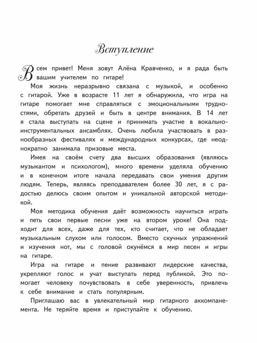 Алёна Кравченко - преподаватель со стажем более тридцати лет, создатель авторской методики, благодаря которой тысячи учеников по всей стране и миру уже самостоятельно научились играть на гитаре!