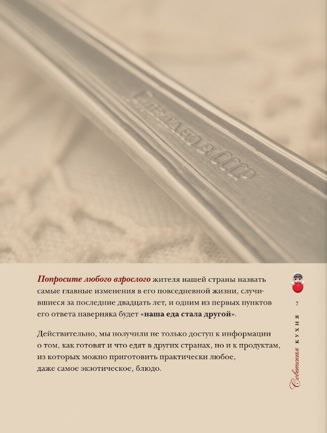 Книга потрясающая - от одного взгляда на каждое блюдо в голове всплывают воспоминания из детства, когда мама или бабушка их готовили. Получается очень вкусно, 1 в 1 как у них. Все написано понятно, простым языком, без заковырок. Отдельно хочу отметить качество книги - белые плотные страницы, твердая (что немаловажно) обложка. Рекомендую к покупке всем, кто, как и я, влюблен в советскую кухню
