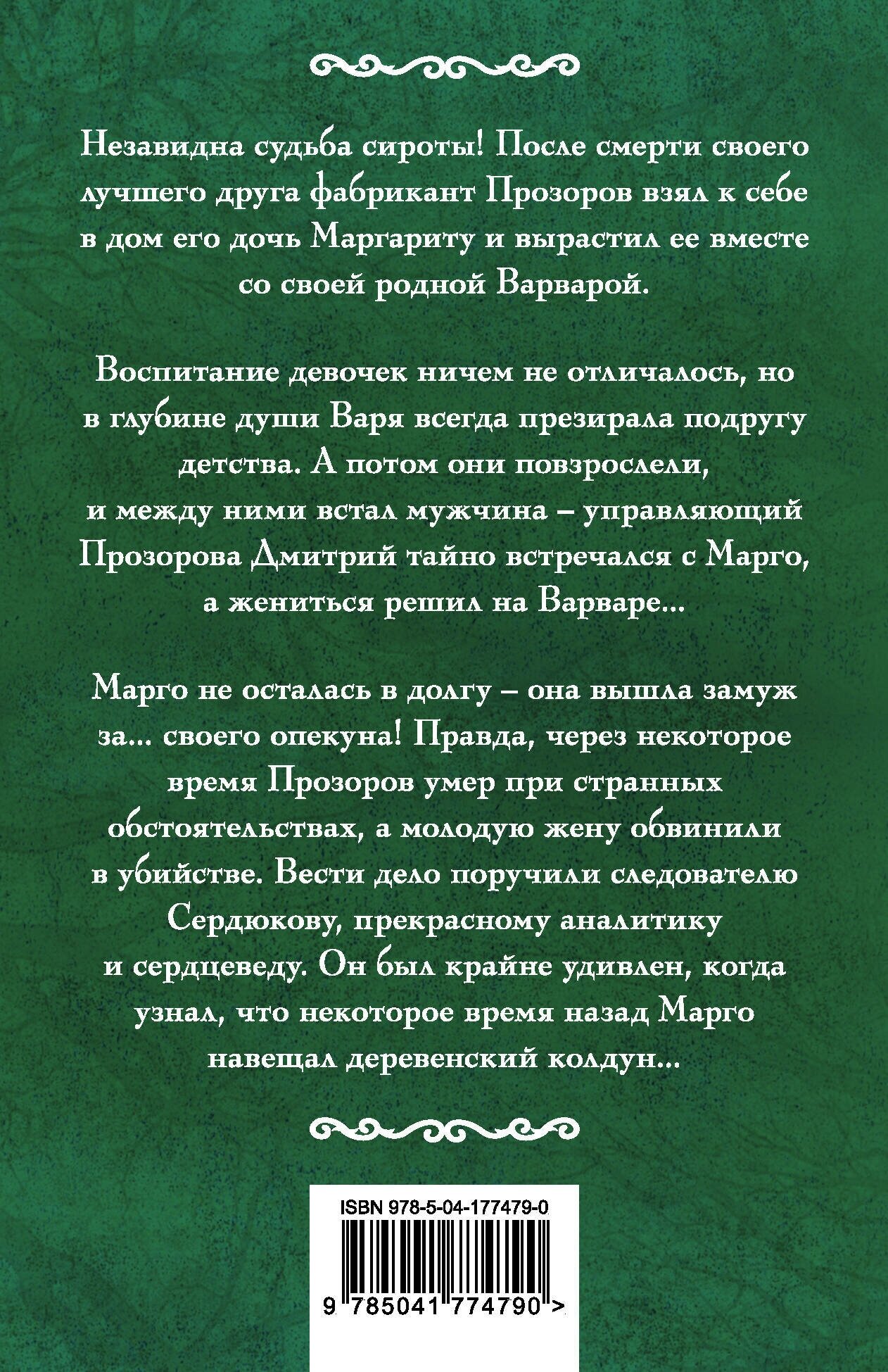 Незавидна судьба сироты! После смерти своего лучшего друга фабрикант Прозоров взял к себе в дом его дочь Маргариту и вырастил ее вместе со своей родной Варварой. Воспитание девочек ничем не отличалось, но в глубине души Варя всегда презирала подругу детства. А потом они повзрослели, и между ними встал мужчина - управляющий Прозорова Дмитрий тайно встречался с Марго, а жениться решил на Варваре… Марго не осталась в долгу - она вышла замуж за… своего опекуна! Правда, через некоторое время Прозоров умер при странных обстоятельствах, а молодую жену обвинили в убийстве. Вести дело поручили следователю Сердюкову, прекрасному аналитику и сердцеведу. Он был крайне удивлен, когда узнал, что некоторое время назад Марго навещал деревенский колдун…
