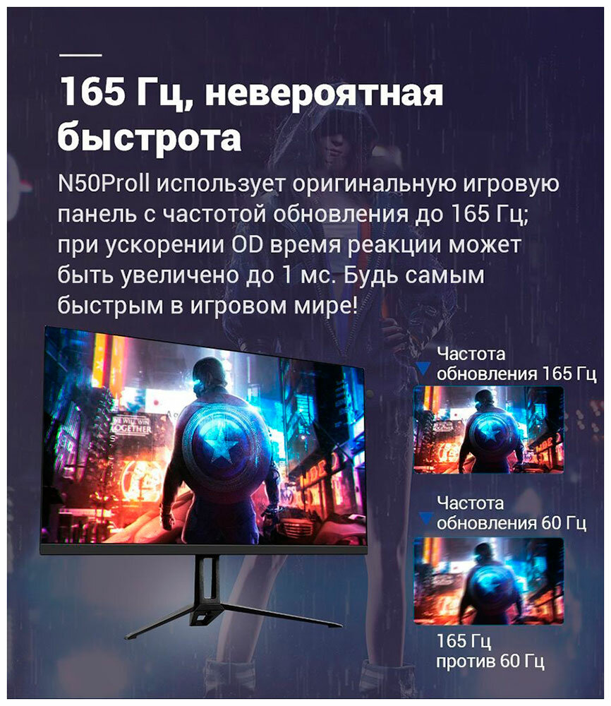 Плюсы. - Цена. За такую цену найти FHD монитор частотой 165Гц и IPS матовой матрицей нереально. - Есть крепление VESA. - Подставка из довольно тяжелого материала, монитор держится устойчиво. Минусы. - Есть небольшие засветы, для меня не критично. Есть настройки по уменьшению голубого цвета для того чтобы глаза не уставали. - Разъем для БП и интерфейсных кабелей (HDMI x 2, DP) выходят назад, а не вниз или бок, по этой причине не получится прислонить максимально близко к стене. Разъем питания показался хлипким. - В комплекте только кабель DP, HDMI нет. По качеству цветопередачи ничего не скажу, так как мало что в этом понимаю. Цвета яркие. Итого. отличный монитор с небольшими косячками которые компенсируются крайне низкой ценой.