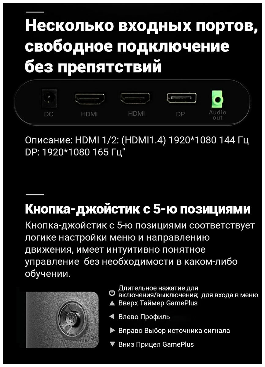 - 5-ти позиционный джойстик для доступа к настройкам, выбора видеовхода и другое
