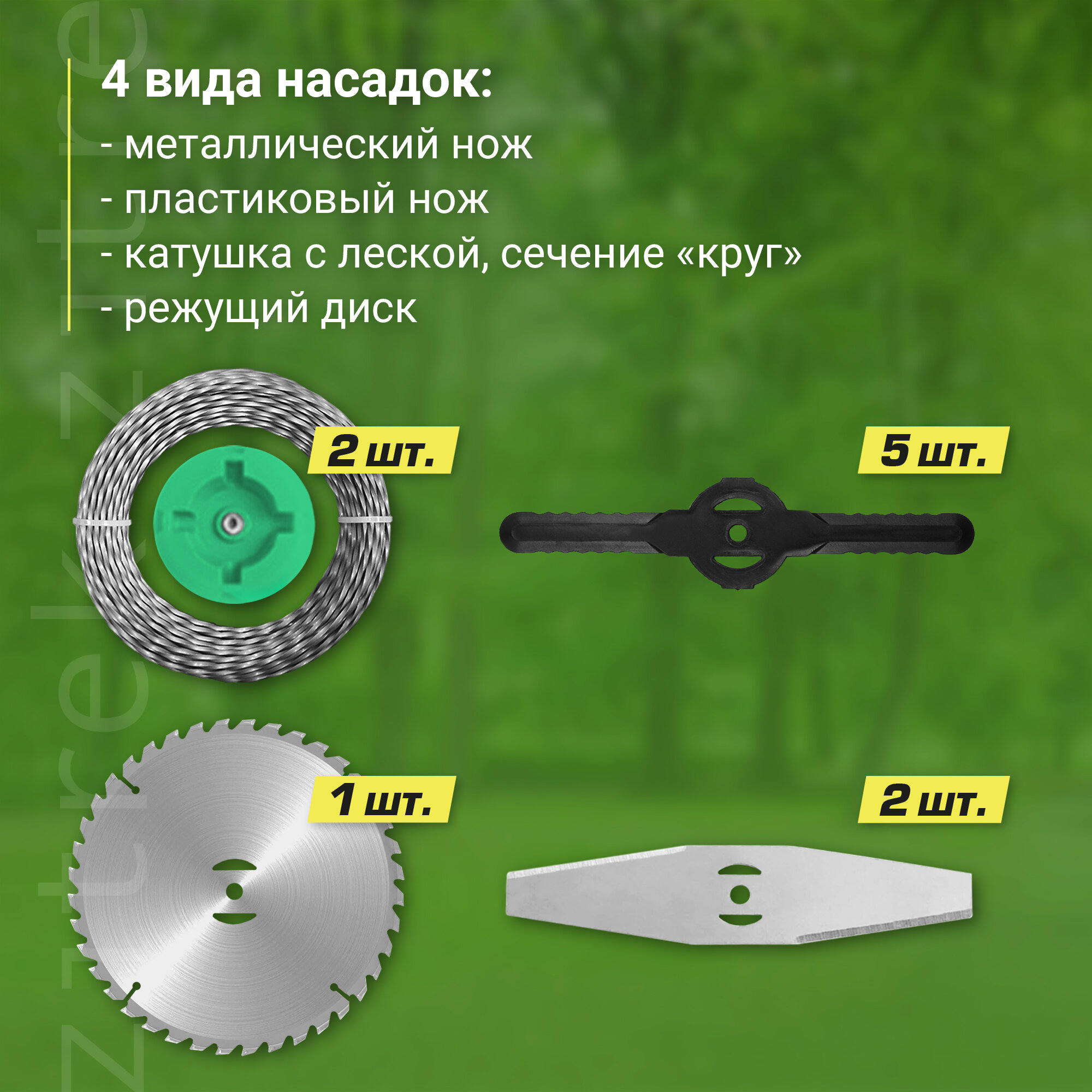 | Дополнительная комплектация | Триммер - 1 шт.; металлический нож - 2 шт.; пластиковый нож - 5 шт.; аккумулятор Li-ion - 2 шт.; зарядное устройство - 1 шт.; шестигранный ключ - 1 шт.; инструкция по эксплуатации - 1 шт. |
