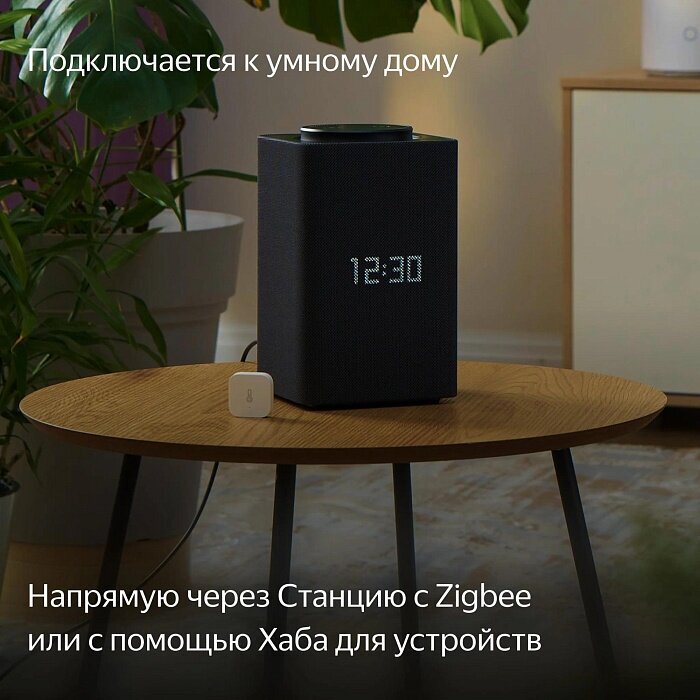 Для комфортного и здорового микроклимата. Измеряет температуру и влажность в комнате и включает устройства умного дома, когда нужно. Беспроводной компактный датчик легко установить практически где угодно. Свяжите датчик с разными устройствами и создавайте сценарии в приложении Дом с Алисой. Например, можно объединить датчик с умным кондиционером и увлажнителем. И настроить сценарий их автоматического запуска, если в комнате станет слишком жарко и сухо. А можно задать значение температуры, при котором дома будет включаться обогреватель. В приложении легко в любой момент проверить статистику и показания датчика. А если связать его со Станцией, достаточно будет просто спросить, например: Алиса, какая температура в детской?. Для подключения датчика к Умному дому с Алисой нужна Станция, поддерживающая протокол Zigbee. Если ваша Станция без Zigbee, для подключения вам понадобится Хаб Яндекса для устройств.