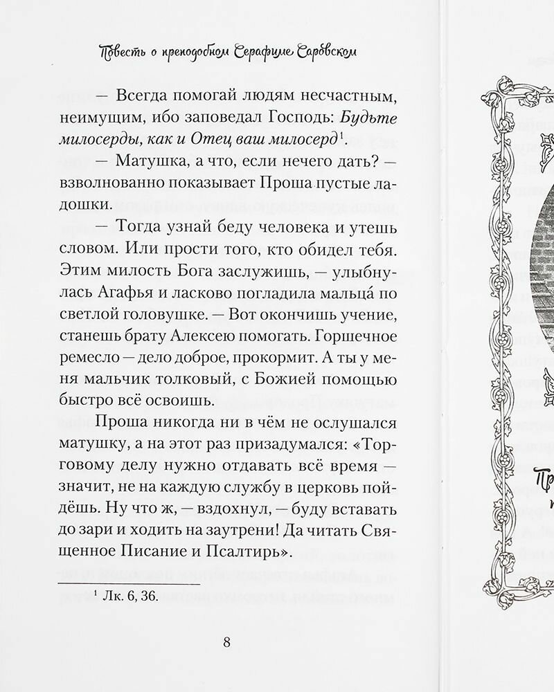 Эта повесть — о великом угоднике Божием, о любимом батюшке всея Руси, о Саровском чудотворце. Составленная из небольших новелл-притч о разных периодах жизни преподобного Серафима, она создает яркий целостный образ. Повесть проникнута светом любви, доброты, уважения, сострадания к человеку как творению Божию. В то же время в ней на конкретных примерах ненавязчиво показано, где пролегает грань между добром и злом, святостью и греховностью. Эти примеры учат, опираясь на заповеди Божии, вдумчиво вглядываться в окружающий нас сложный и противоречивый мир и понимать истинную цену тем или иным человеческим словам и деяниям.