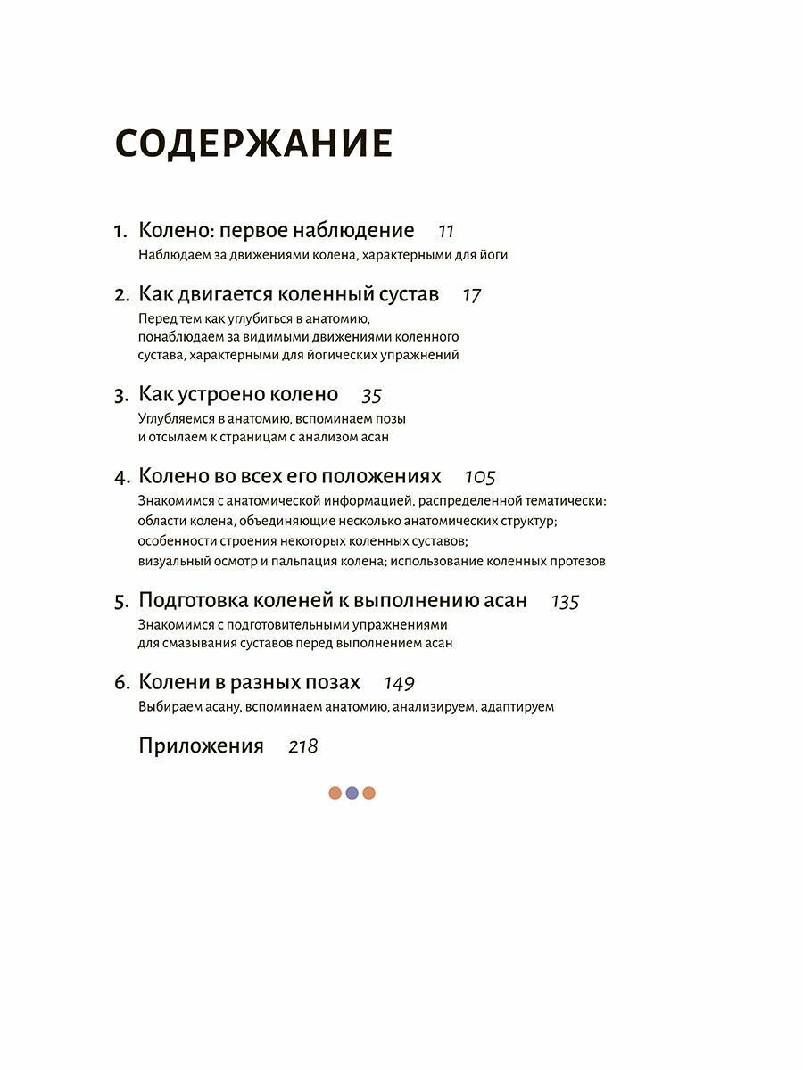 Это руководство рассказывает о том, как устроен суставной хрящ, что такое синовиальная жидкость, где расположены мениски, связки, мышцы… А главное, объясняет, как все эти элементы должны взаимодействовать, чтобы обеспечить правильное, сбалансированное положение каждого колена при выполнении той или иной асаны. Здесь приводится подробный анализ разных поз йоги и даются рекомендации по подготовке к ним, адаптации и корректировке.