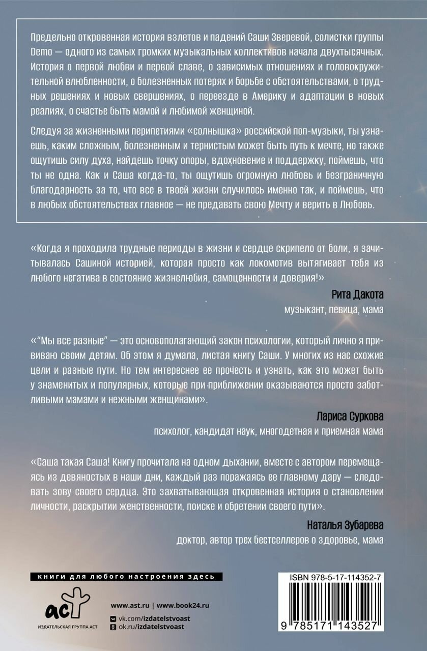Предельно откровенная история взлетов и падений Саши Зверевой. История о первой любви и первой славе, о зависимых отношениях и головокружительной влюбленности, о болезненных потерях и борьбе с обстоятельствами, о трудных решениях и новых свершениях, о переезде в Америку и адаптации в новых реалиях, о счастье быть мамой и любимой женщиной. Следуя за жизненными перипетиями "солнышка" российской поп-музыки, ты узнаешь, каким сложным, болезненным и тернистым может быть путь к мечте, но также ощутишь силу духа, найдешь точку опоры, вдохновение и поддержку, поймешь, что ты не одна. Как и Саша когда-то, ты почувствуешь огромную любовь и безграничную благодарность за то, что все в твоей жизни случилось именно так, и поймешь, что в любых обстоятельствах главное - не предавать свою Мечту и верить в Любовь.