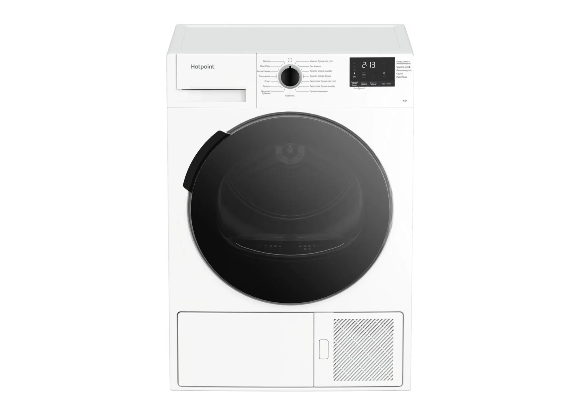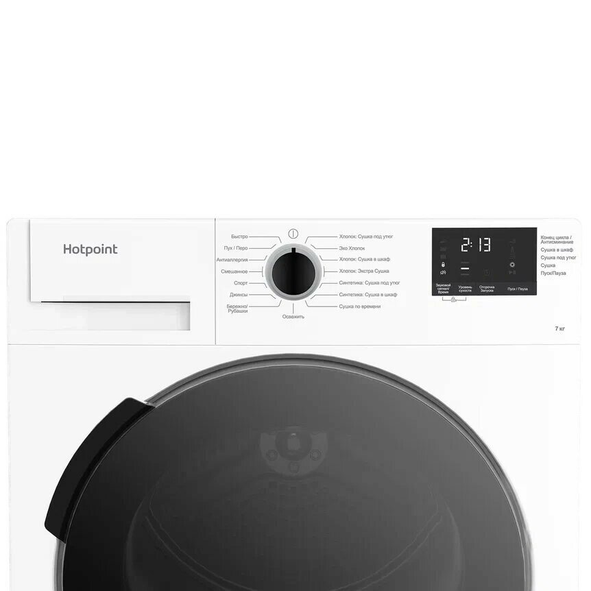Сушильная машина Hotpoint размером 84,6х59,7х50,8 см весит 39,5 кг и потребляет 2,35 кВт электроэнергии. Механическим переключателем, расположенным спереди, можно выбрать одну из 15 программ работы, руководствуясь русифицированным меню. Подсветка дисплея дает возможность пользоваться устройством при любом освещении. В барабан вмещается до 7 кг вещей. Рельефная «пузырьковая» поверхность обеспечивает бережную сушку белья. Таймером можно отложить старт на время вплоть до одних суток. Звуковой сигнал, оповещающий об окончании функционирования, можно отключить. Световые индикаторы показывают, сколько осталось до завершения цикла высушивания. Опция самодиагностики неисправностей увеличивает срок службы модели, защита от детей повышает безопасность эксплуатации.