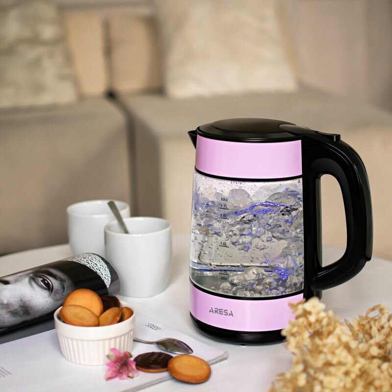 В интерьер новой кухни нужен был стеклянный чайник нежно-сиреневого цвета, недорогой, объемом не менее 1,5л., не так-то и легко было найти. Чайник выглядит очень качественно, стыки ровные, панели плотные, кнопка и включатель работают четко, ручка удобная. Вода закипает быстро, не очень шумный, есть внутренняя подсветка.