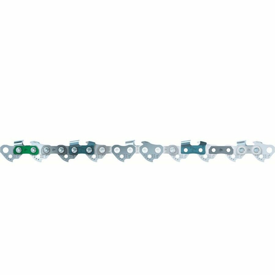 На зубьях цепи расположена маркировка, которая показывает степень износа и позволяет правильно соблюдать угол при заточке цепи. На ведущих звеньях расположены смазочные каналы, по которым масло поступает на шарниры, равномерно смазывая цепь, что продлевает срок ее службы.