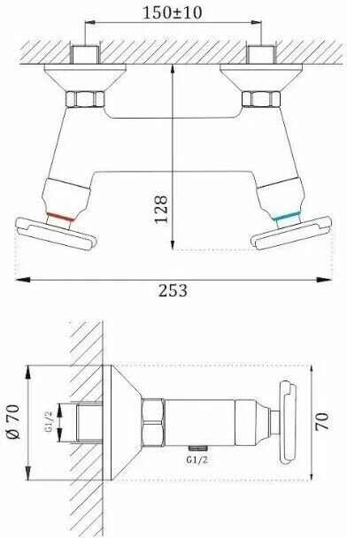 Смеситель изготовлен из латуни. Диаметр декоративных чашек 70 мм. Душевой гарнитур в комплекте. Цвет хром.