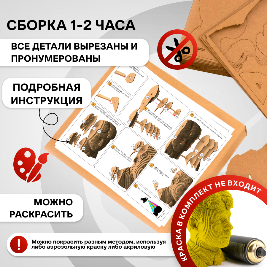 Это оригинальные 3D конструкторы (сборные модели). Каждый комплект изготовлен из пищевого гофрокартона – нетоксичного, экологически чистого материала, пригодного для повторного использования. А каждая деталь вырезана и прономерована при помощи высокоточной лазерной резки. Конструктор легко собрать по прилагаемой инструкции.