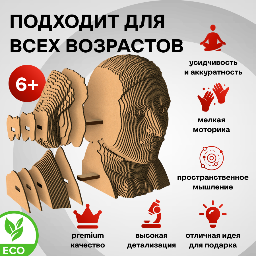 Это оригинальные 3D конструкторы (сборные модели). Каждый комплект изготовлен из пищевого гофрокартона – нетоксичного, экологически чистого материала, пригодного для повторного использования. А каждая деталь вырезана и прономерована при помощи высокоточной лазерной резки. Конструктор легко собрать по прилагаемой инструкции.