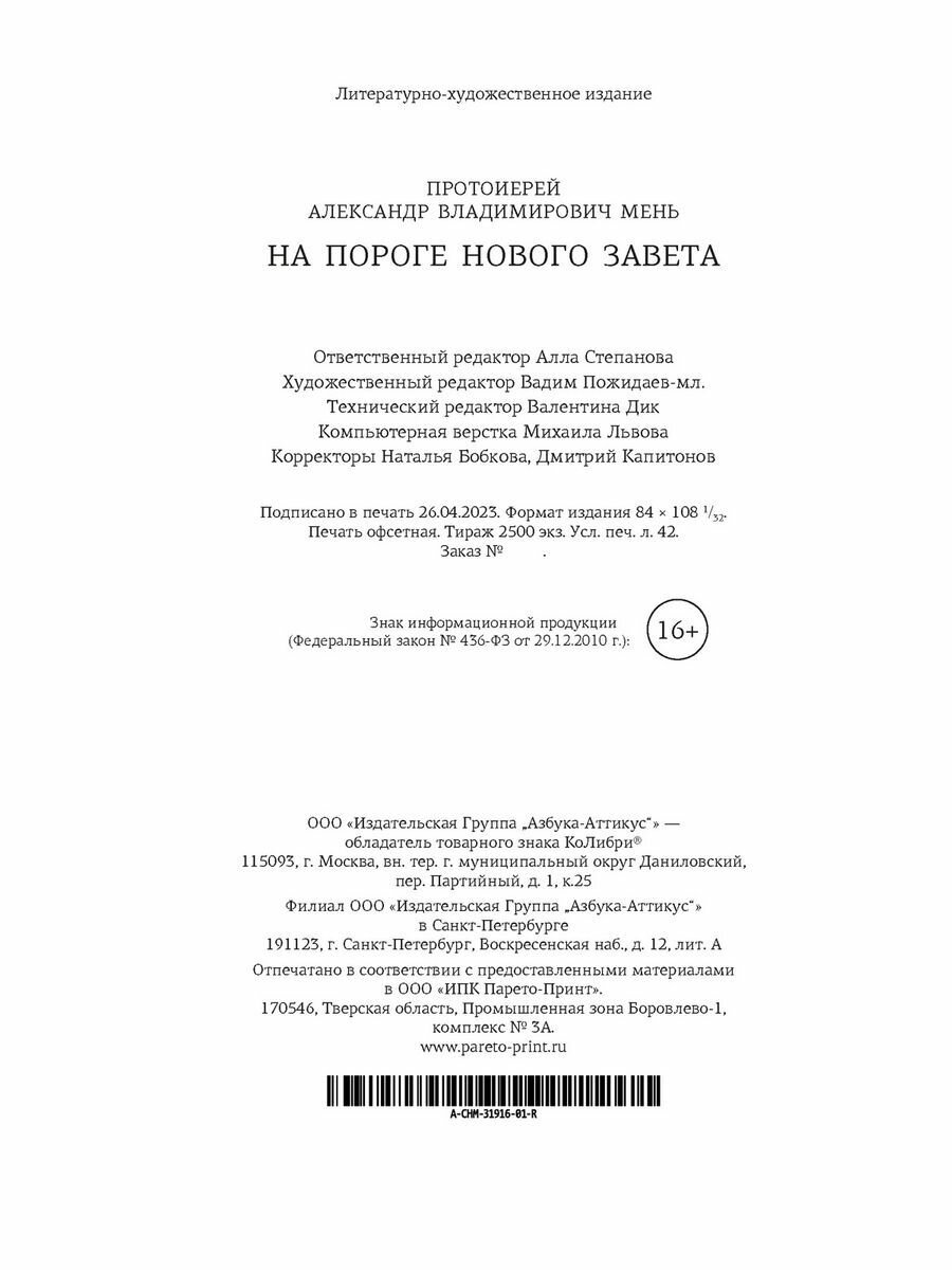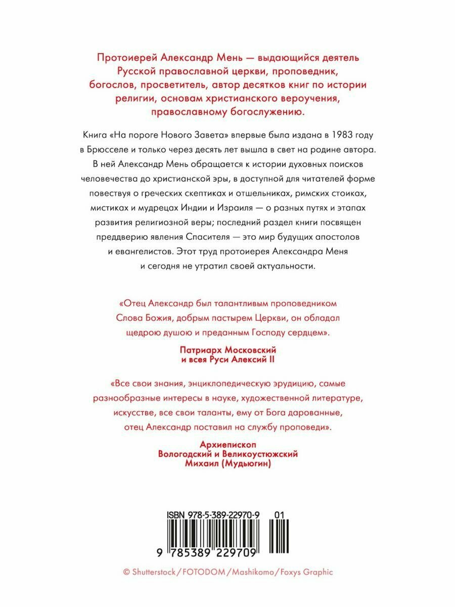 Книга "На пороге Нового Завета" впервые была издана в 1983 году в Брюсселе и только через десять лет вышла в свет на родине автора. В ней Александр Мень обращается к истории духовных поисков человечества до христианской эры, в доступной для читателей форме повествуя о греческих скептиках и отшельниках, римских стоиках, мистиках и мудрецах Индии и Израиля - о разных путях и этапах развития религиозной веры; последний раздел книги посвящен преддверию явления Спасителя - это мир будущих апостолов и евангелистов. Этот труд протоиерея Александра Меня и сегодня не утратил своей актуальности.