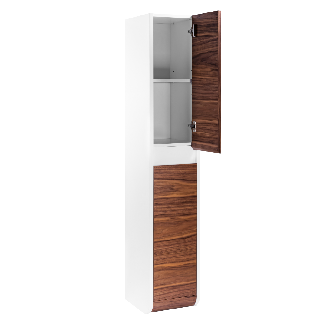 Неотразимое сочетание оригинальности и современного стиля. Закругленный фасад подчеркнет индивидуальность вашего дизайна. Комбинация древесной текстуры с белым глянцем не оставит ванную комнату без внимания.