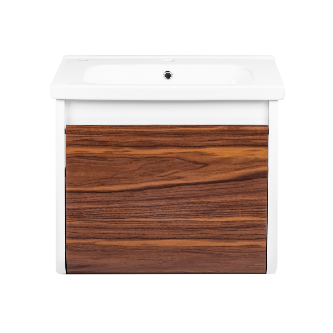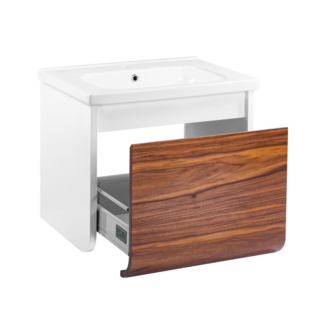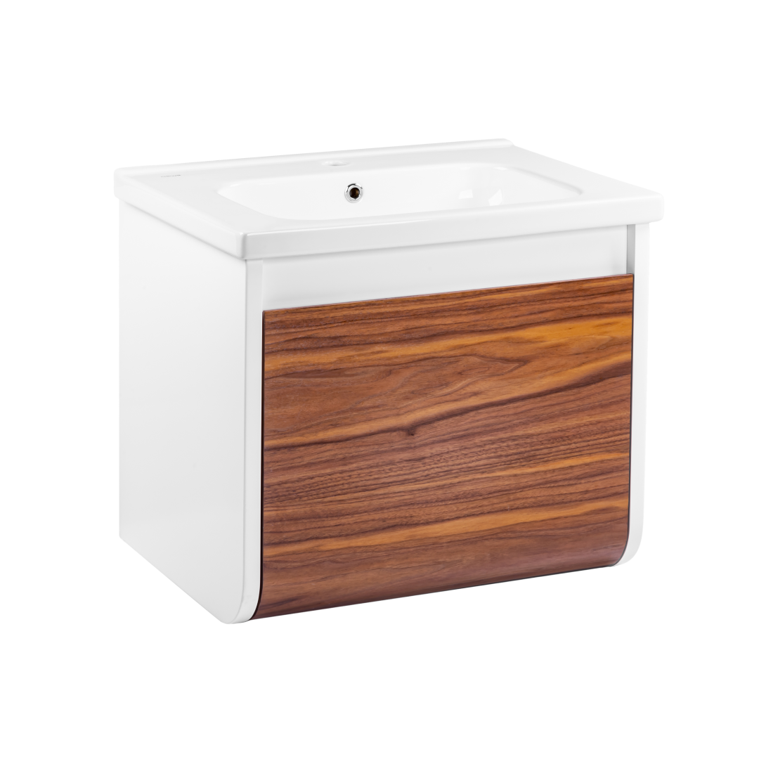Неотразимое сочетание оригинальности и современного стиля. Закругленный фасад подчеркнет индивидуальность вашего дизайна. Комбинация древесной текстуры с белым глянцем не оставит ванную комнату без внимания.
