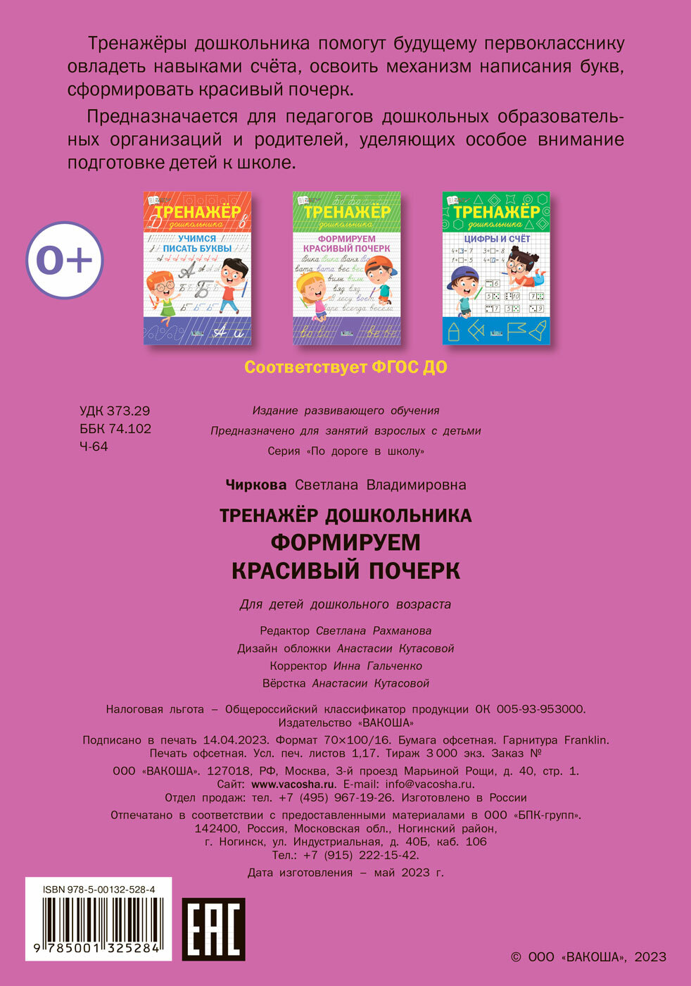 Тренажёр дошкольника. Формируем красивый почерк. ФГОС ДО (Чиркова Светлана Владимировна); Вакоша, 2023