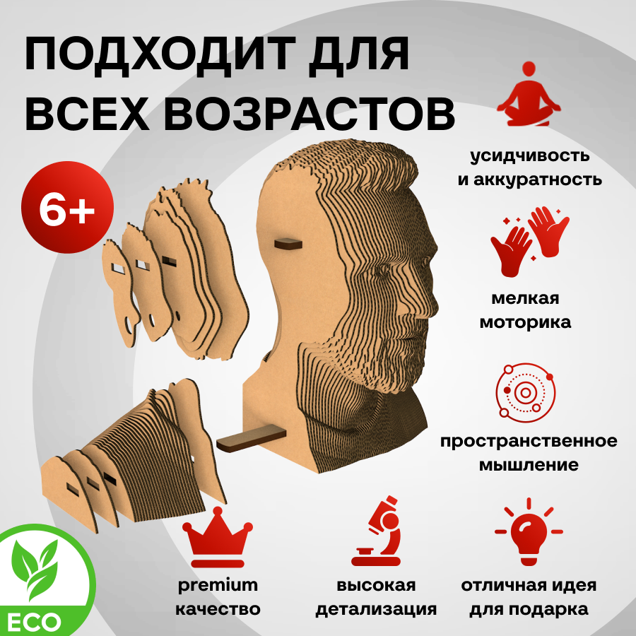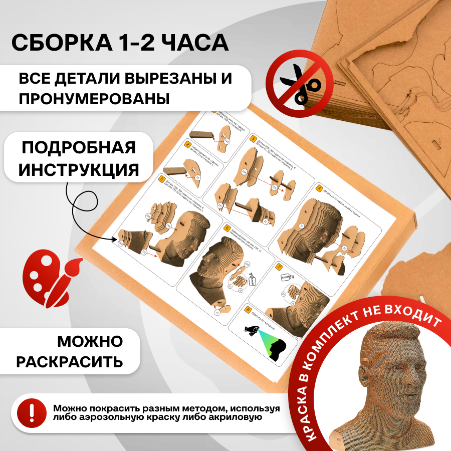 Если вы любите удивлять или ищете оригинальный презент, то сборная модель бюста великого футболиста - лучшее решение. Из листов картона собирается настоящая скульптура, которая как две капли воды похожа на оригинал! Листы картона плавно образуют черты лица великого футбольного гения, кумира миллионов.