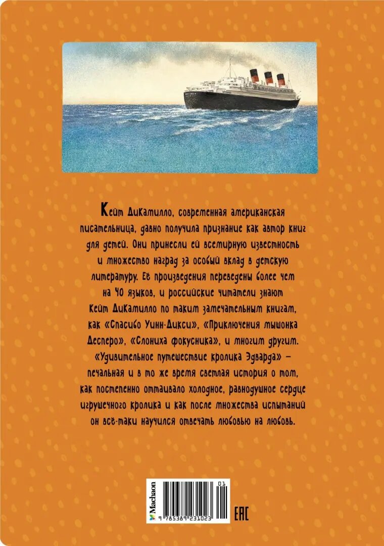 Книги современной американской писательницы Кейт ДиКамилло уже называют классикой. Они переведены более чем на 40 языков, и их успели полюбить читатели разных стран. Все её книги, начиная с повести «Спасибо Уинн-Дикси», хорошо известны нашим читателям, а «Удивительное путешествие кролика Эдварда» постоянно переиздаётся. История игрушечного кролика, чьё безразличное, холодное сердце после множества испытаний всё же оттаяло и научилось отвечать любовью на любовь, никого не оставляет равнодушным и заставляет задуматься об очень важных вещах – доброте, сострадании, умении прощать…