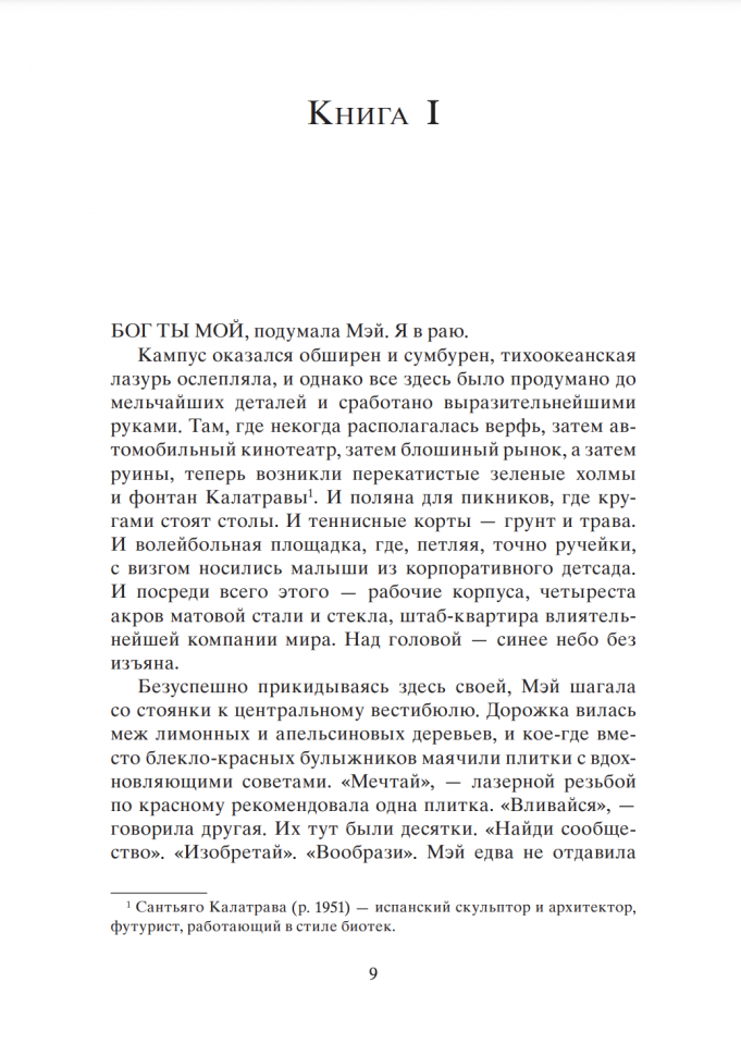 Мэй Холланд крупно повезло. Она работает в идеальной компании "Сфера" - союз блистательных умов поколения, где все прислушиваются ко всем и все вдохновенно совершенствуют мир. Здесь Мэй окружают единомышленники, ее любят, ее труд ценят, начальство тревожится о ее личном благополучии и здоровье родных, а за просчеты критикуют мягко, потому что в Мэй верят.