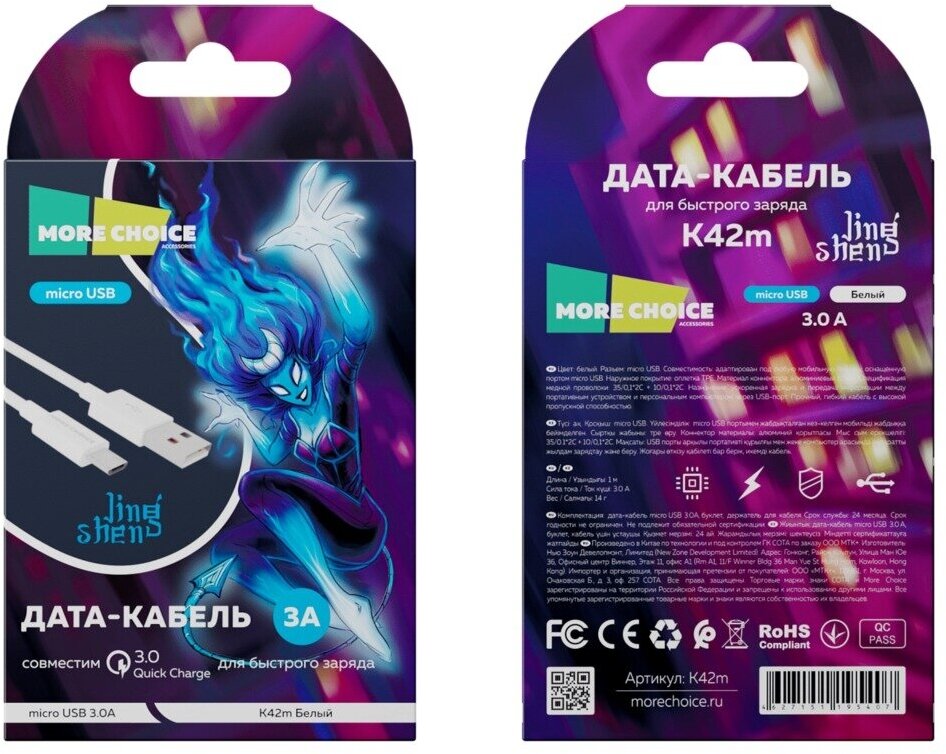 Дата-кабель More choice K42S предназначен для быстрого заряда и передачи информации. Это прочный, гибкий кабель с высокой пропускной способностью. Коннектор сделан из сплава алюминия, оплетка из термоэластопласта.