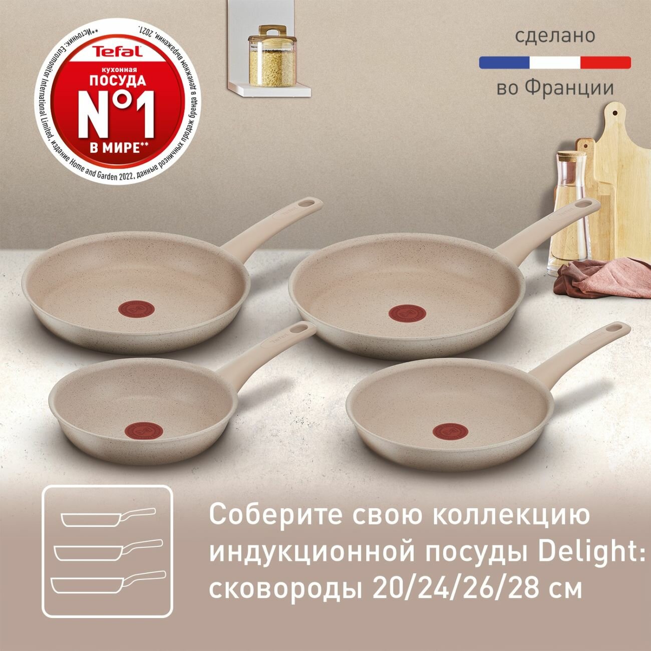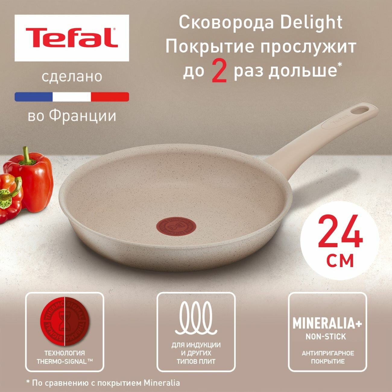От привычных перекусов на бегу до праздничных застолий – ничто не сравнится с истинным удовольствием от домашней еды. Откройте для себя Tefal Delight – функциональную сковороду, которая поможет вам приготовить полезные блюда с бескомпромиссным вкусом и ароматом. Нежные стейки из тунца, хрустящие вегетарианские бургеры или аппетитный сладкий картофель – готовьте вкусную и здоровую пищу с использованием самых последних инноваций Tefal, долговечных материалов и актуального дизайна в корпусе из 100% переработанного алюминия. Антипригарное покрытие Mineralia позволит готовить любимые блюда без жира или масла, не изменяя текстуру или вкус ингредиентов. Технология Thermo-Signal™ от Tefal покажет оптимальную температуру для начала приготовления, а дно Thermo-Fusion™ обеспечит равномерное распределение тепла по всей сковороде. Серия Tefal Delight - это идеальное решение для вкусных и полезных рецептов, доведенных до совершенства. Для продления срока службы посуды мы не рекомендуем мыть ее в посудомоечной машине. Воздействие абразивных веществ, содержащихся в моющих средствах, в сочетании с высокой температурой, негативно сказывается на покрытии.