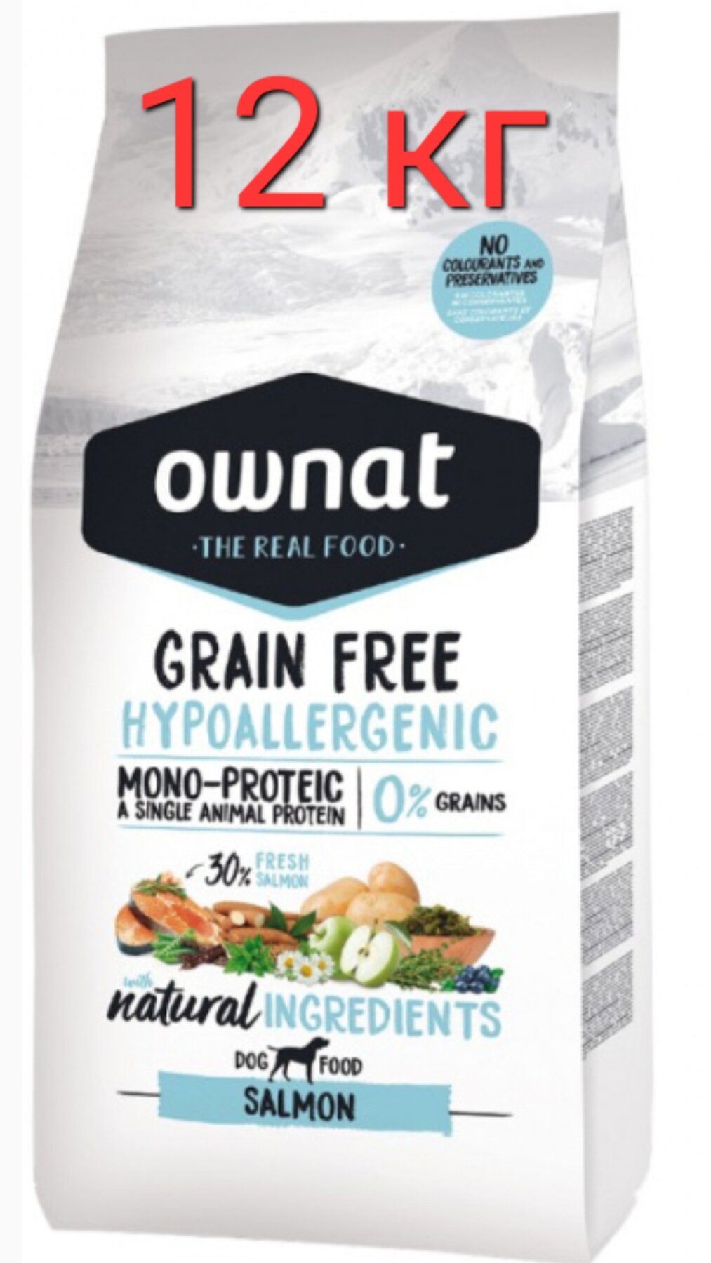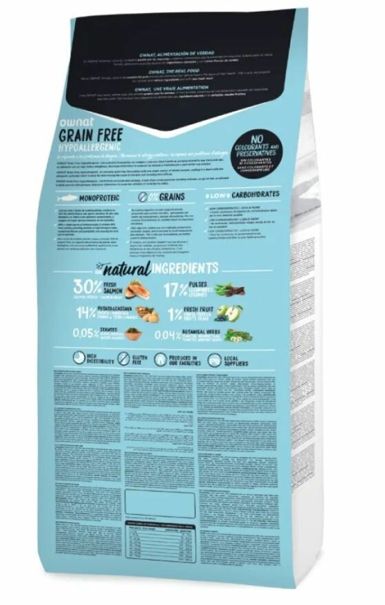 OWNAT– это корм класса супер-премиум, произведённый в солнечной Испании.Корма являются полноценным рационом для ваших питомцев, легко усваиваются и обладают высокой вкусовой привлекательностью. Холистик корма OWNAT приготовлены только из ингредиентов высочайшего качества, которые привозят на производство местные фермеры. А благодаря нутрициологам все компоненты корма смешаны в идеальных пропорциях, чтобы сохранить всю пользу продуктов так, как и задумано природой. OWNAT – по-настоящему натуральный корм! Полноценный и сбалансированный корм OWNAT GF HYPO, изготовленный из лосося как единственного источника животного белка и не содержащий злаков, обеспечивает организм вашего питомца всеми необходимыми питательными веществами. Отсутствие злаков существенно снижает риск возникновения пищевой аллергии. Лосось содержит оптимальное количество незаменимых жирных кислот Омега 3 и 6, которые очень важны для поддержания здоровой кожи и блестящей шерсти. Преимущества: Изготовлен из натуральных ингредиентов и свежей рыбы – до 30% свежего лосося. Сбалансированный состав содержит в правильной пропорции питательные компоненты, необходимые для гармоничного развития организма. Современные технологии позволяют максимально сохранять все питательные вещества из сырья и оптимизировать усвояемость ингредиентов. Благодаря высокому содержанию белка происходит быстрое насыщение, питомец получает все необходимые аминокислоты. При изготовлении корма не используются искусственные красители и консерванты. Глюкозамин и хондроитин – для профилактики болезней суставов. Высокое содержание Омега-3 делает кожу здоровой, а шерсть шелковистой и блестящей. Произведено в Испании.