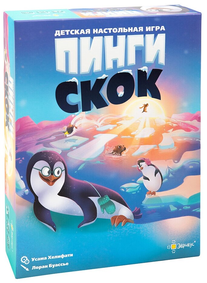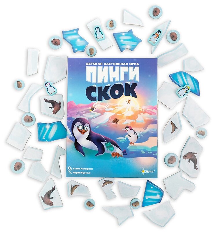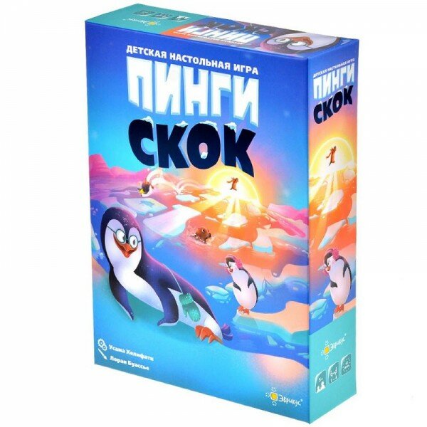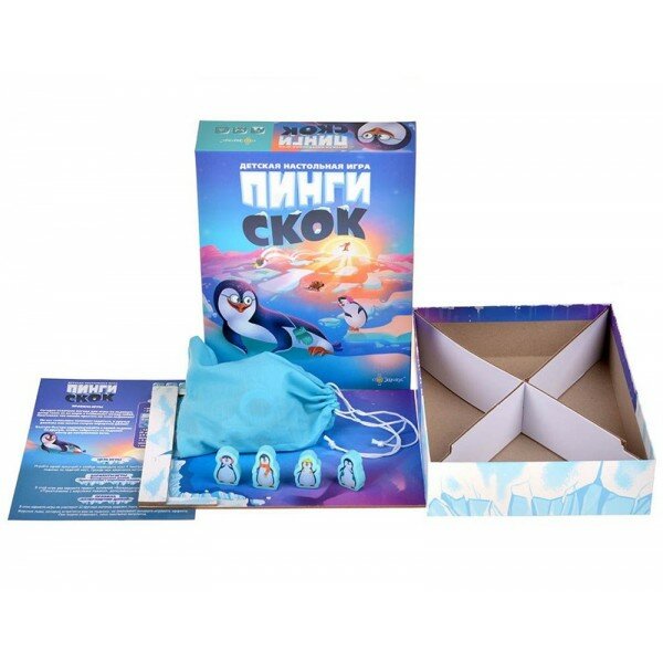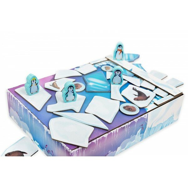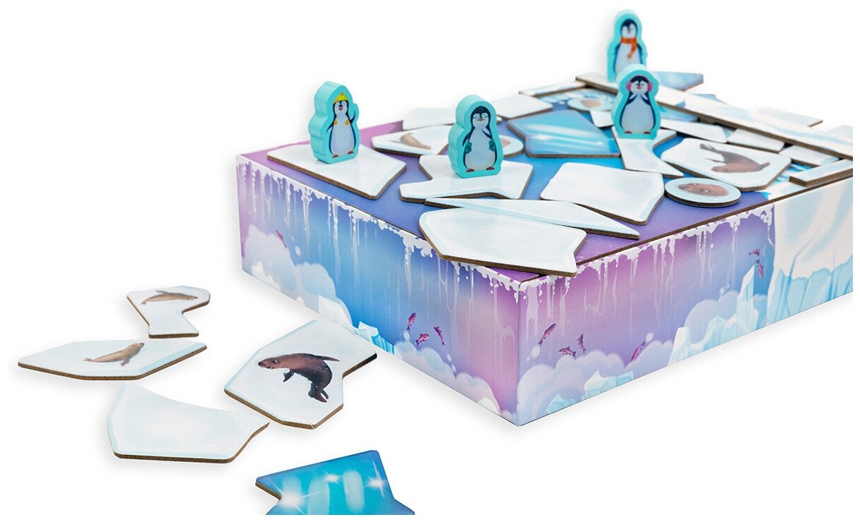 Весь день пингвинчики весело играют на льдинах. Но солнышко уже садится, и друзья должны как можно скорее вернуться домой! Быстро, быстро, быстро – прыгайте с одной льдины на другую, чтобы добраться до берега до наступления ночи. ""- это кооперативная детская игра с объёмным полем, в которой игрокам предстоит сообща спасать маленьких пингвинов. Кому подойдёт эта игра? -Активным и ловким малышам -Для игры в семейном кругу -В подарок маленькому любителю настольных игрКак играть? Цель игры- привести всех пингвинов на берег, перемещая фигурки по постоянно меняющемуся полю. В свой ход игроки должны выполнить несколько действий: • вытащить новую льдину из мешочка; • толкнуть ею другие льдины , чтобы соединить их в цепочки; • передвинуть фигурки пингвинов, перемещая их с льдины на льдину или скользя по ним. Игра заканчивается в двух случаях: • Пингвины успевают добраться до берега вовремя • Мешок с льдинами пустеет, а на льдинах игрового поля остались пингвины