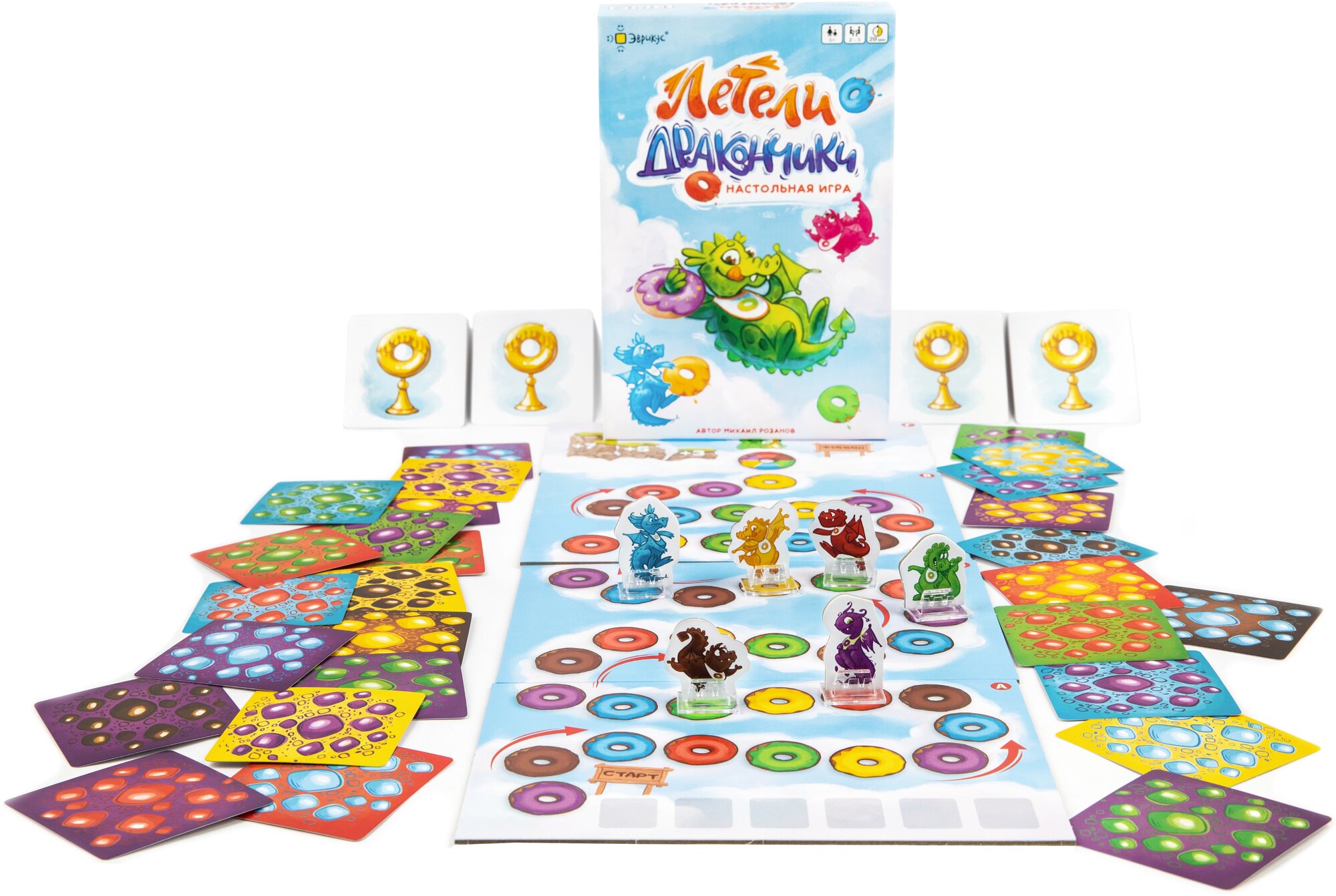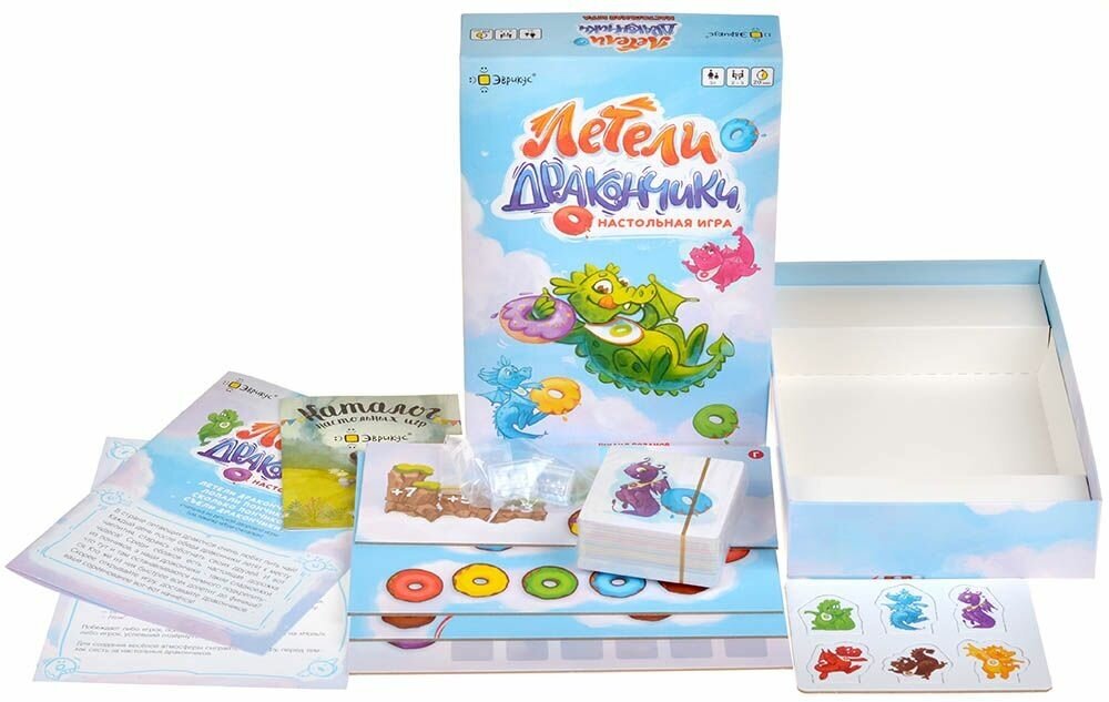 | Комплектация | 6 фигурок дракончиков, 6 пластиковых подставок, 60 карточек полета, 20 карточек целей, 4 части игрового поля, Правила игры, Памятка «Игра-считалка» |