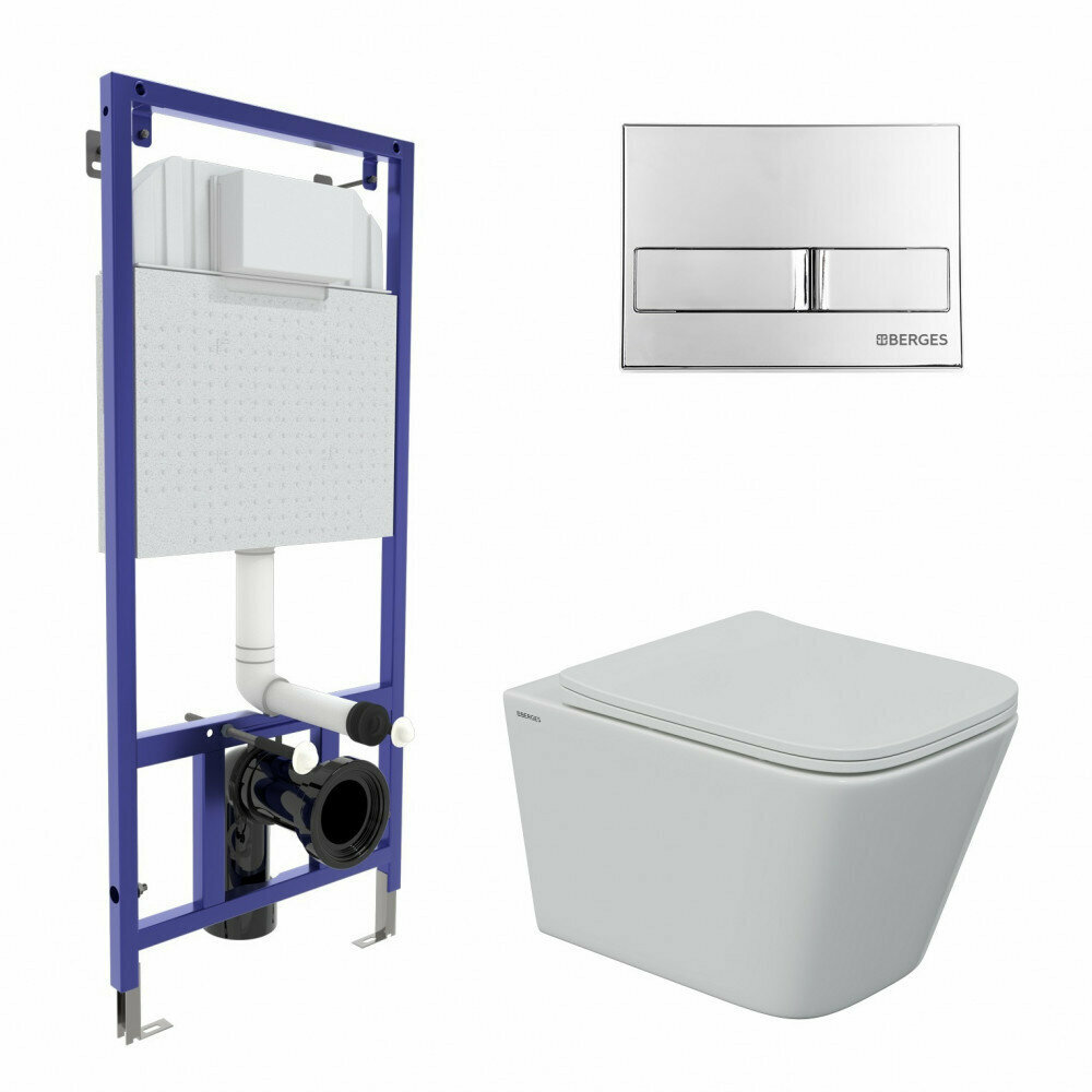 Унитаз с инсталляцией Berges Novum 043242 - комплект для монтажа подвесного унитаза: инсталляция NOVUM525: толщина бачка 80 мм, резервуар воды объемом 10 литров с тепло-шумоизоляцией, объем смыва 3/6 литра с возможностью регулировки, нагрузка 400 кг, антикоррозийное покрытие, кнопка L3 хром глянец, ABS-пластик. Унитаз FLOE S: безободковый смыв, сидение дюропласт Floe S Slim SO: микролифт, быстросъемное. Все крепежи для установки в комплекте. Возможность установки в угол. Гарантия 10 лет.