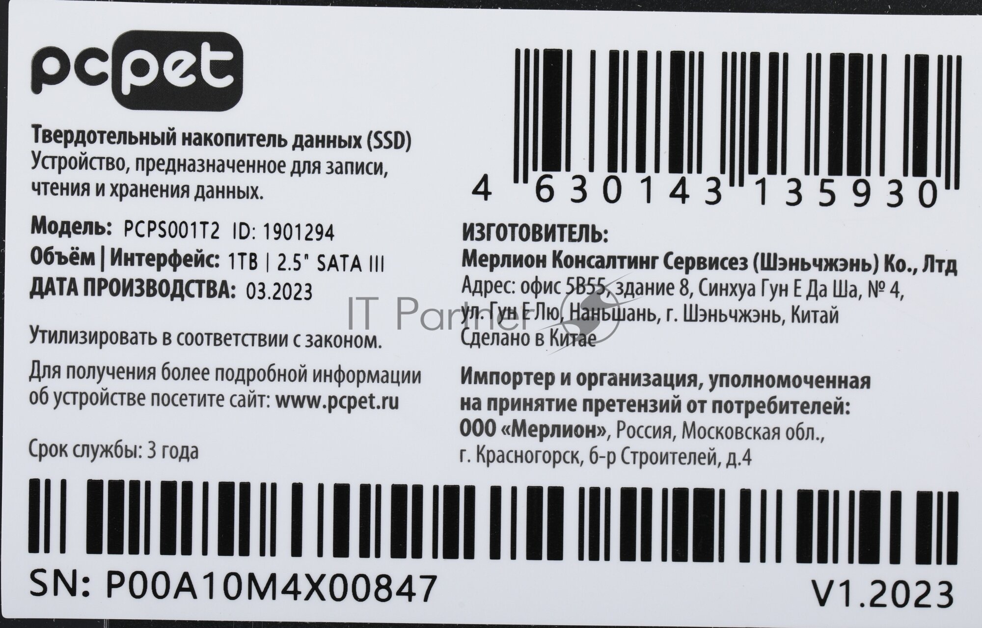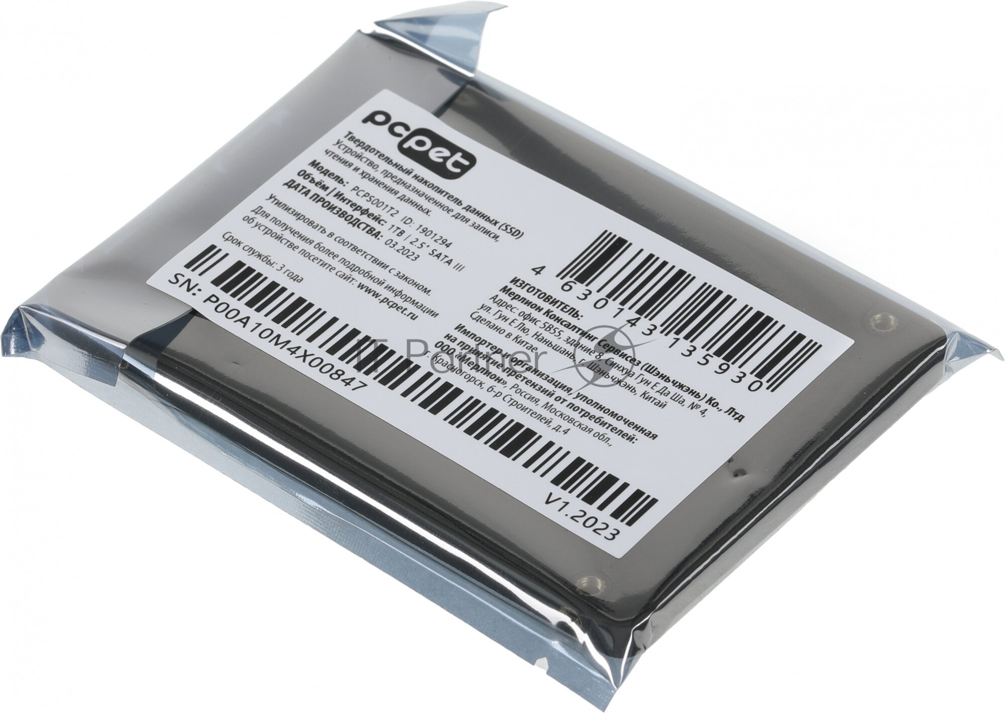 Накопитель SSD PC Pet PCPS001T2, объем накопителя 1TB, форм-фактор: 2.5", интерфейс: SATA III, тип NAND: 3D, скорость чтения до 500МБ/с, скорость записи до 450МБ/с