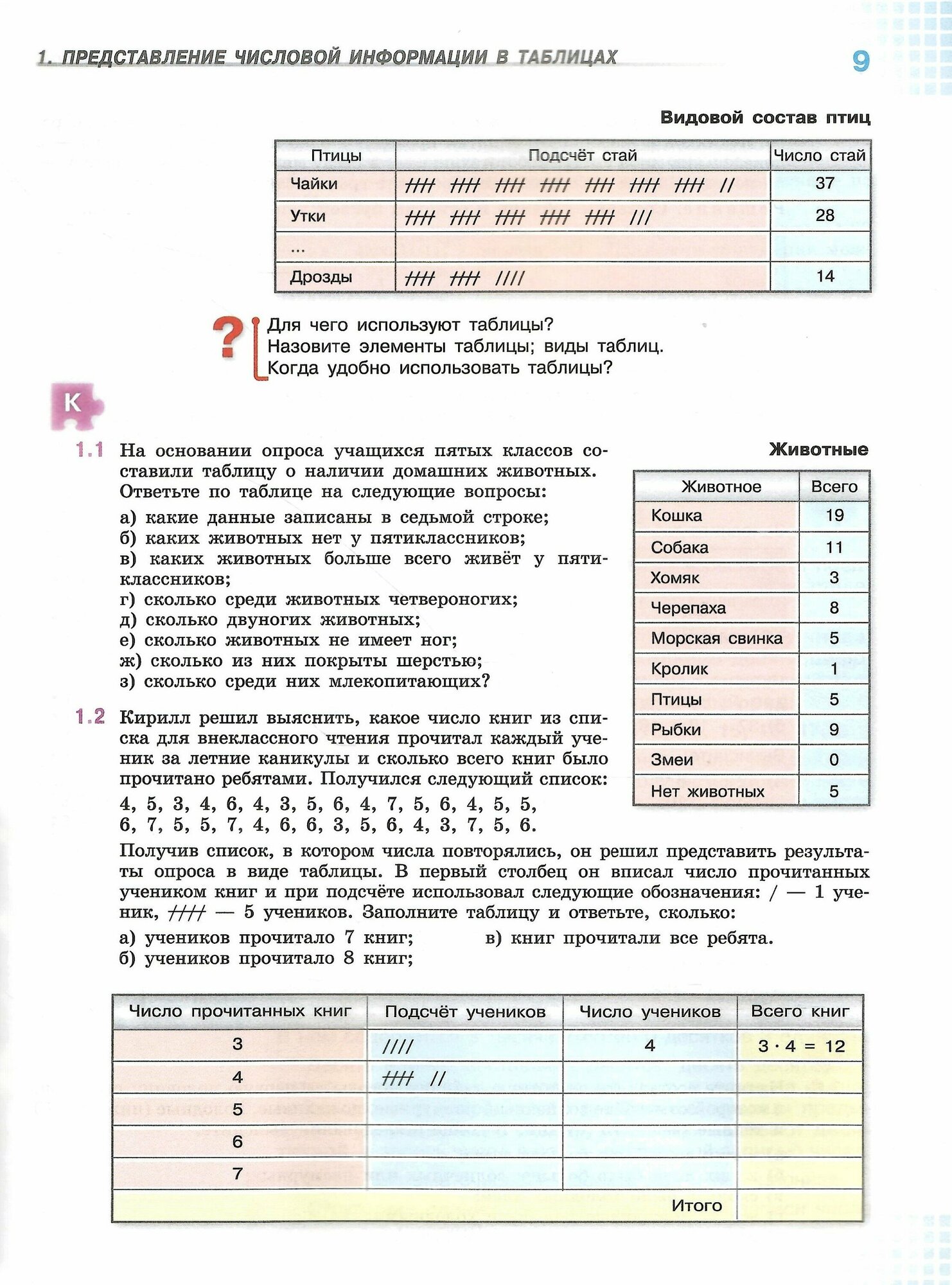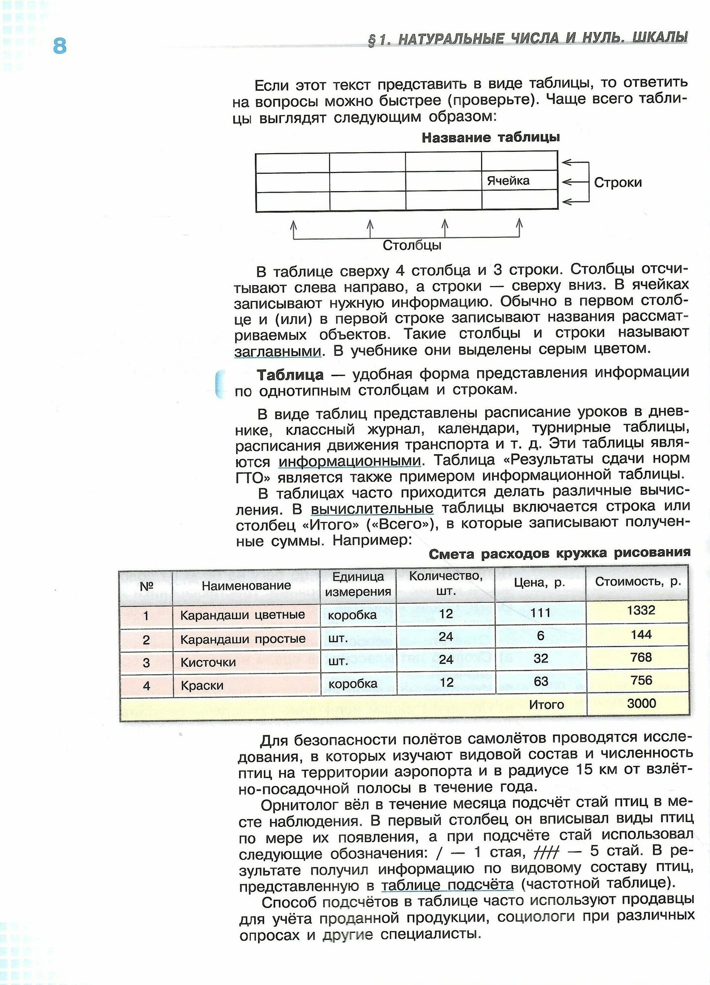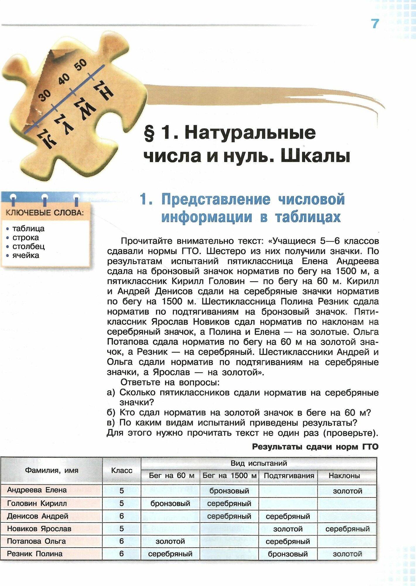 Учебник состоит из двух частей. Первая часть посвящена изучению натуральных чисел и знакомству с начальными сведениями из геометрии. Учебник имеет большую и хорошо организованную систему заданий, подразделяющуюся на три основные группы: для работы в классе, для повторения ранее пройденного материала и для домашней работы. В этих группах специальными значками выделены задания для устного выполнения, задания для работы в группах учащихся, практические работы.