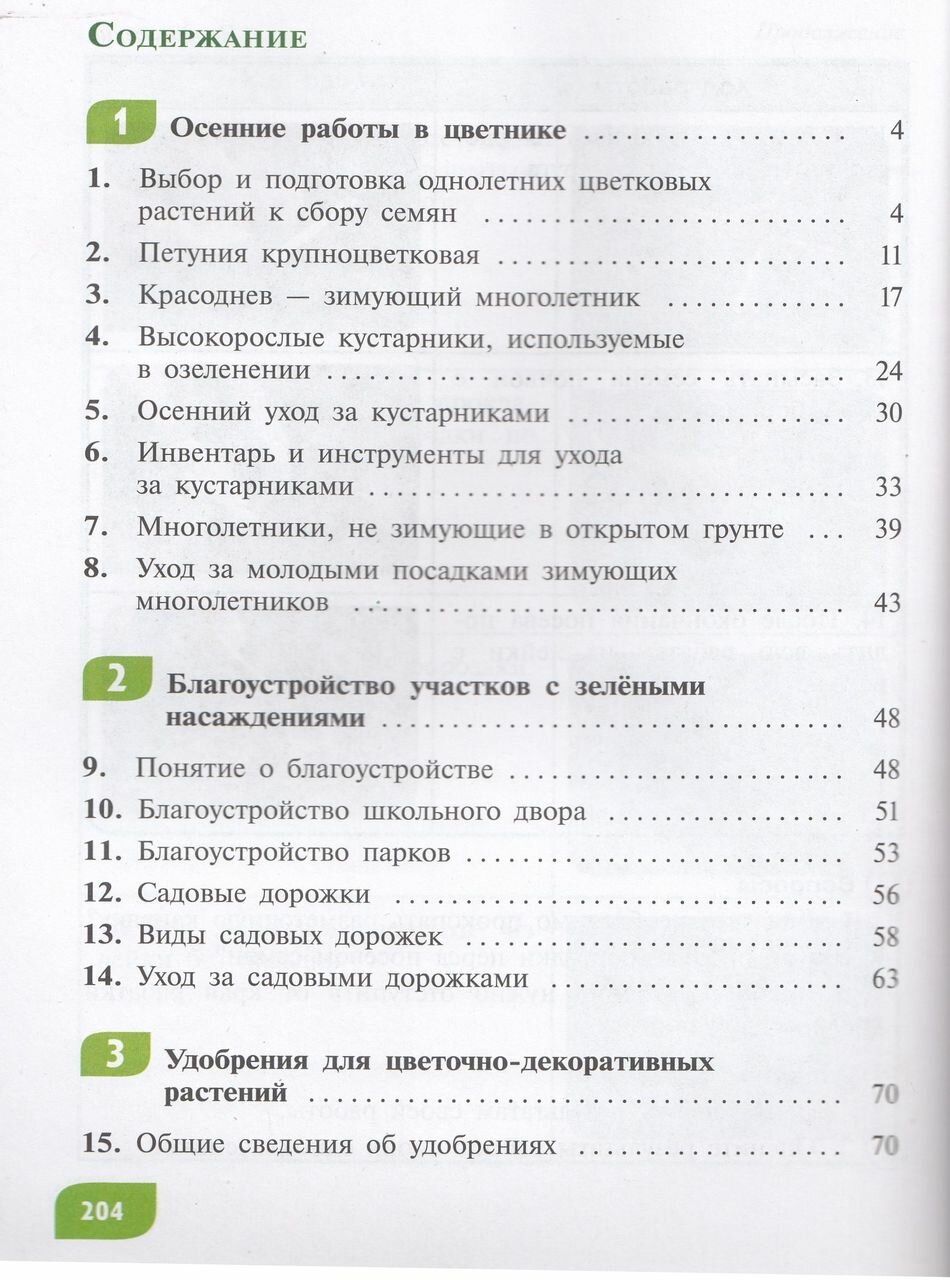 Содержание учебника имеет практико-ориентированную направленность. Учащиеся продолжат осенние и весенние работы в цветнике, познакомятся с благоустройством участков с зелёными насаждениями и различными видами садовых дорожек, узнают о классификации цветковых растений и различных видах удобрений, изучат новые растения. В кабинете-мастерской учащиеся продолжат рабрту с комнатными растениями, познакомятся с различными видами размножения растений, научатся выращивать рассаду однолетних цветочных растений. Знания и навыки, полученные на занятиях по цветоводству и декоративному садоводству, пригодятся учащимся в повседневной жизни.