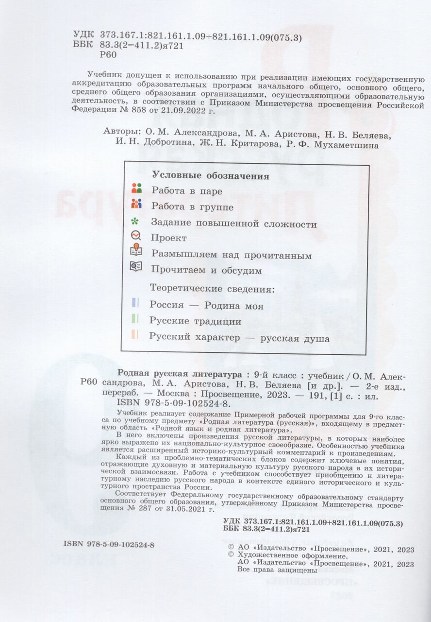 Учебник соответсвует ФГОС 2021 г. Учебник реализует содержание Примерной рабочей программы для 9-го класса по учебному предмету «Родная литература (русская)», входящему в предметную область «Родной язык и родная литература». В него включены произведения русской литературы, в которых наиболее ярко выражено их национально-культурное своеобразие. Особенностью учебника является расширенный историко-культурный комментарий к произведениям. Каждый из проблемно-тематических блоков содержит ключевые понятия, отражающие духовную и материальную культуру русского народа в их исторической взаимосвязи. Работа с учебником способствует приобщению к литературному наследию русского народа в контексте единого исторического и культурного пространства России. Соответствует Федеральному государственному образовательному стандарту основного общего образования, утверждённому Приказом № 287 от 31.05.2021 г.