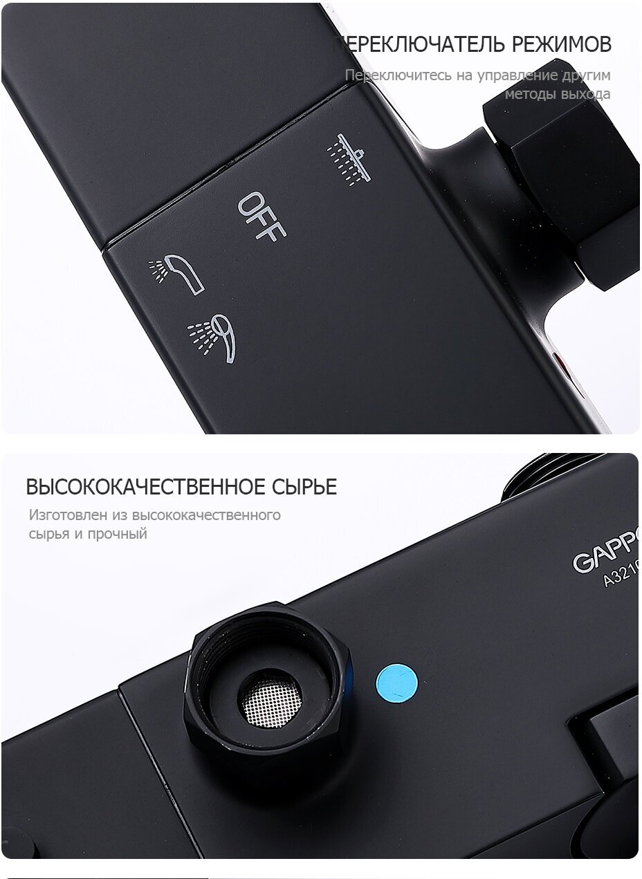 Стильная и современная душевая система Gappo никого не оставит равнодушным. Плавные и четкие линии, многорежимная работа — все это в одной душевой стойке. Режимов всего пять, 3 из них ручной душ, один тропический и еще один излив. Угол наклона лейки тропический душ регулируется, как и высота самой штанги. Повороты гусака позволяют переключаться между режимами, так же на стойке предусмотрен еще один переключатель. Помимо изысканного дизайна душевая система Gappo оснащена термостатом. Такое современное решение добавит много комфорта в вашу жизнь. Достаточно один раз выставить понравившуюся температуру и нажать кнопку, чтобы система ее запомнила. Также термостат выручает в случае перебоев с давлением.