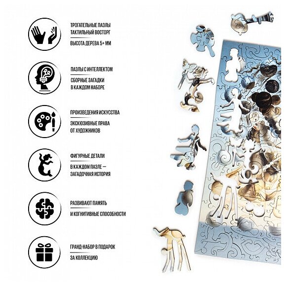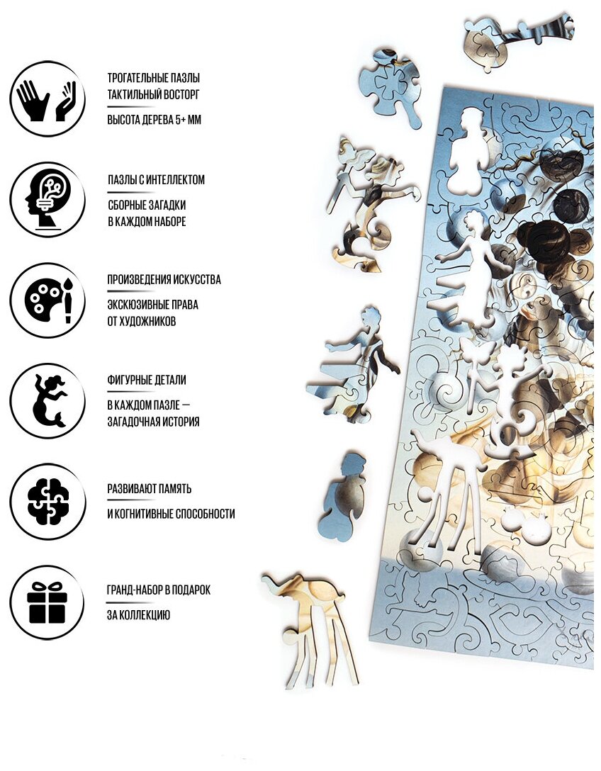 Работы Сальвадора Дали в сферических деталях пазла. Полет фантазий, сложенный из многих образов работ Сальвадора Дали. Нарезка пазла расшита сферическими элементами, продолжающими символизм картины «Галатея сфер». Образ Дали складывается из 13 деталей. Образ Наблюдателя проявляется в резе полностью собранного пазла, если смотреть на него издалека.