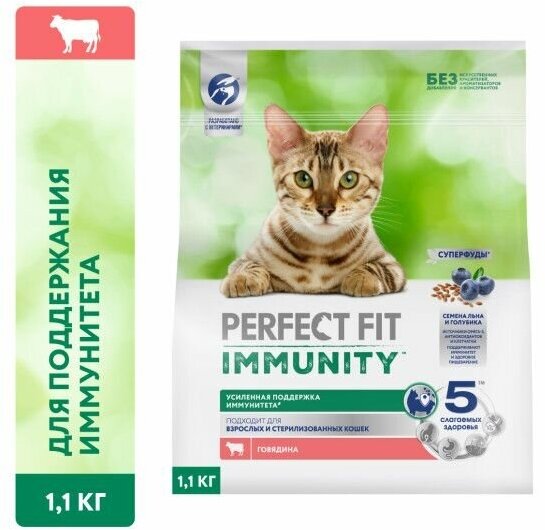 PERFECT FIT Immunity Корм сух.говядинасемена льна и голубика д/кошек 11кг PERFECT FIT (10255390)