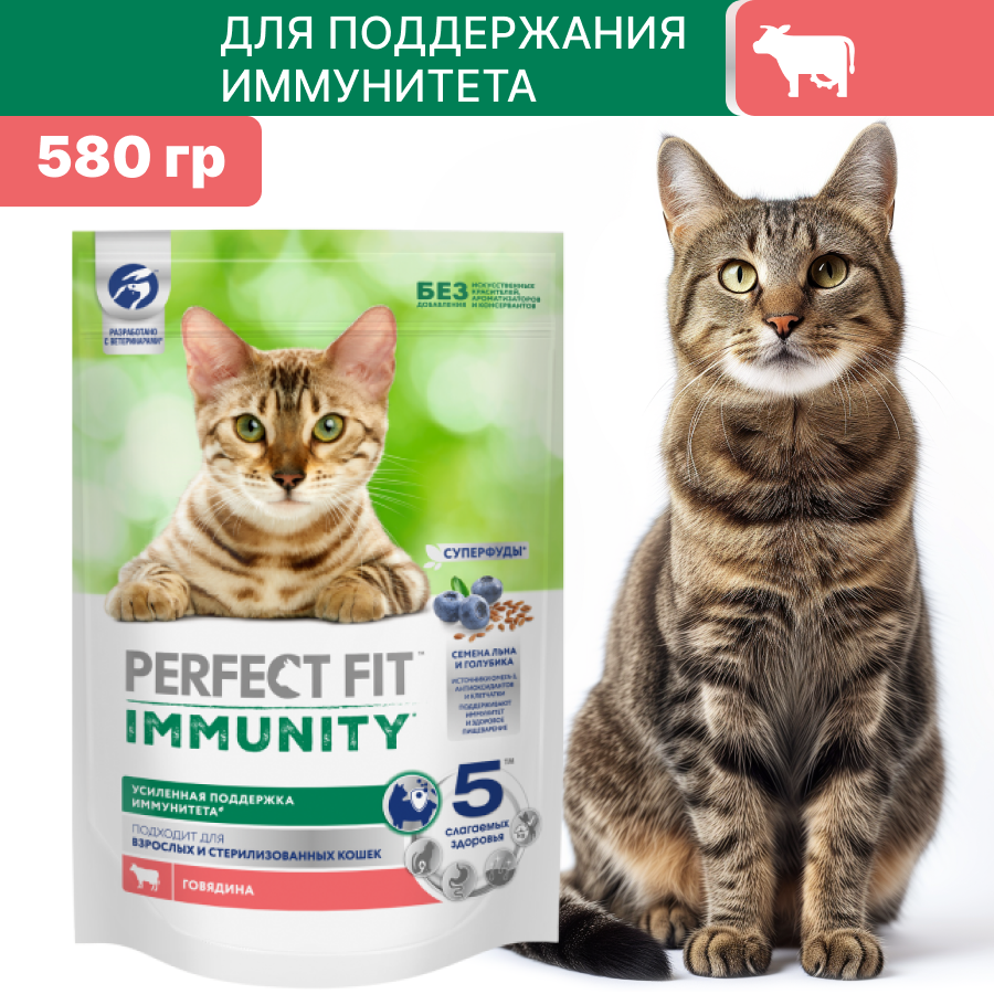 PERFECT FIT Immunity Корм сух.говядинасемена льна и голубика д/кошек 580г PERFECT FIT (10255387)