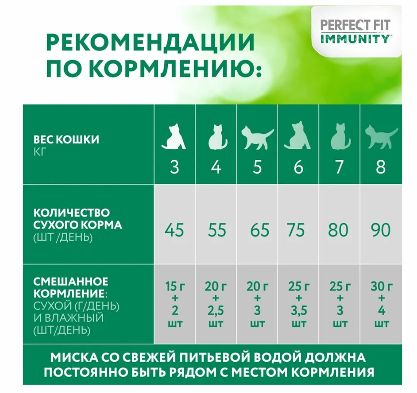Сухой корм для кошек PERFECT FIT IMMUNITY™ производится без добавления искусственных красителей, ароматизаторов и консервантов. Рационы PERFECT FIT IMMUNITY™ подходят для всех котов и кошек, в том числе для стерилизованных.