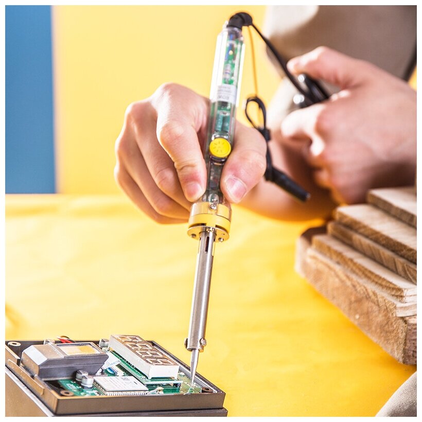 Данная модель оснащена керамическим нагревателем, за счет чего разогревается гораздо быстрее классических паяльников. Обладает колесиком регулировки температуры, необычным прозрачным корпусом ручки и кабелем длиной 1,5 метра.
