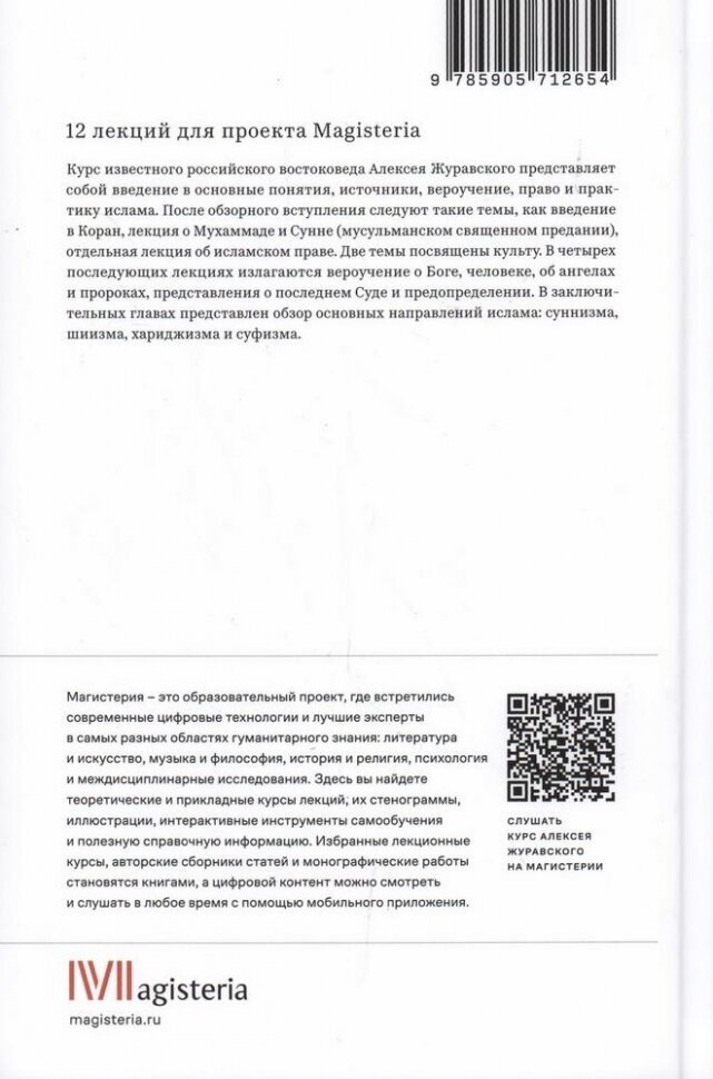 Перед вами сборник лекций об исламе, прочитанных Алексеем Васильевичем Журавским для проекта "Магистерия". Это целостное и доступное религиоведческое введение в систему представлений, норм и практик одной из мировых религий, представителями которой являются в настоящее время 1,6 млрд. человек, или 23% населения земного шара. Автор - старший научный сотрудник Института классического востока и античности НИУ ВШЭ, доцент Свято-Филаретовского православно-христианского института.