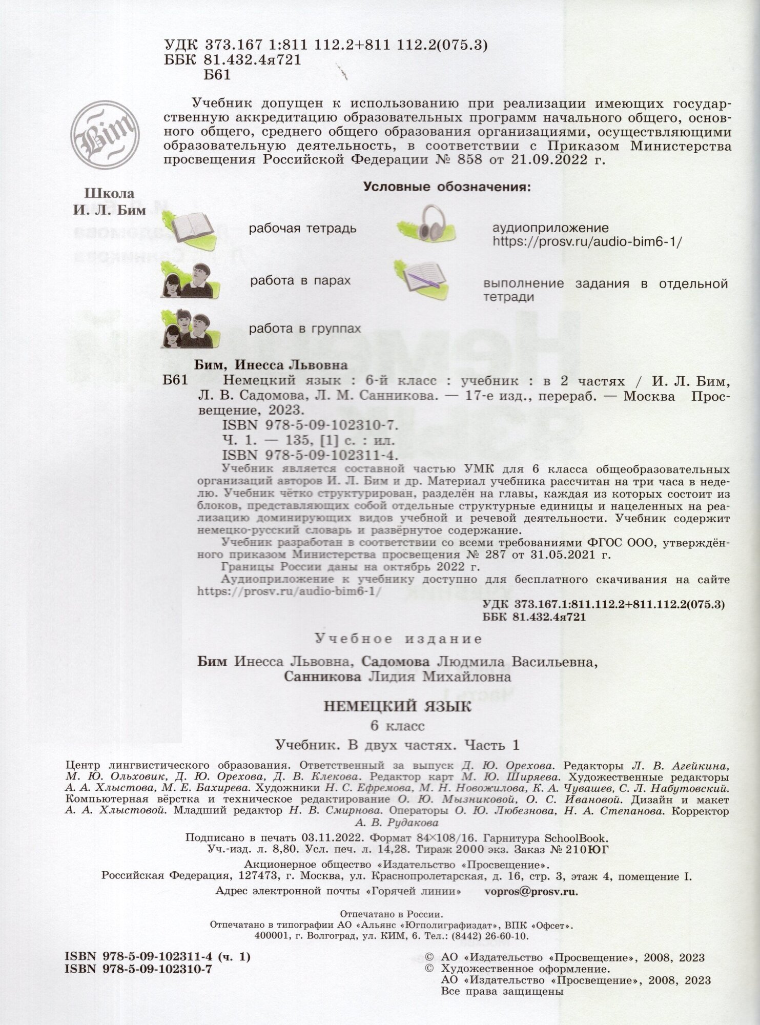 Deutsch. Немецкий язык. 6 класс. Учебник. В двух частях. Часть 1 (Людмила Васильевна Садомова, Лидия Михайловна Санникова, Инесса Львовна Бим); Просвещение, 2024