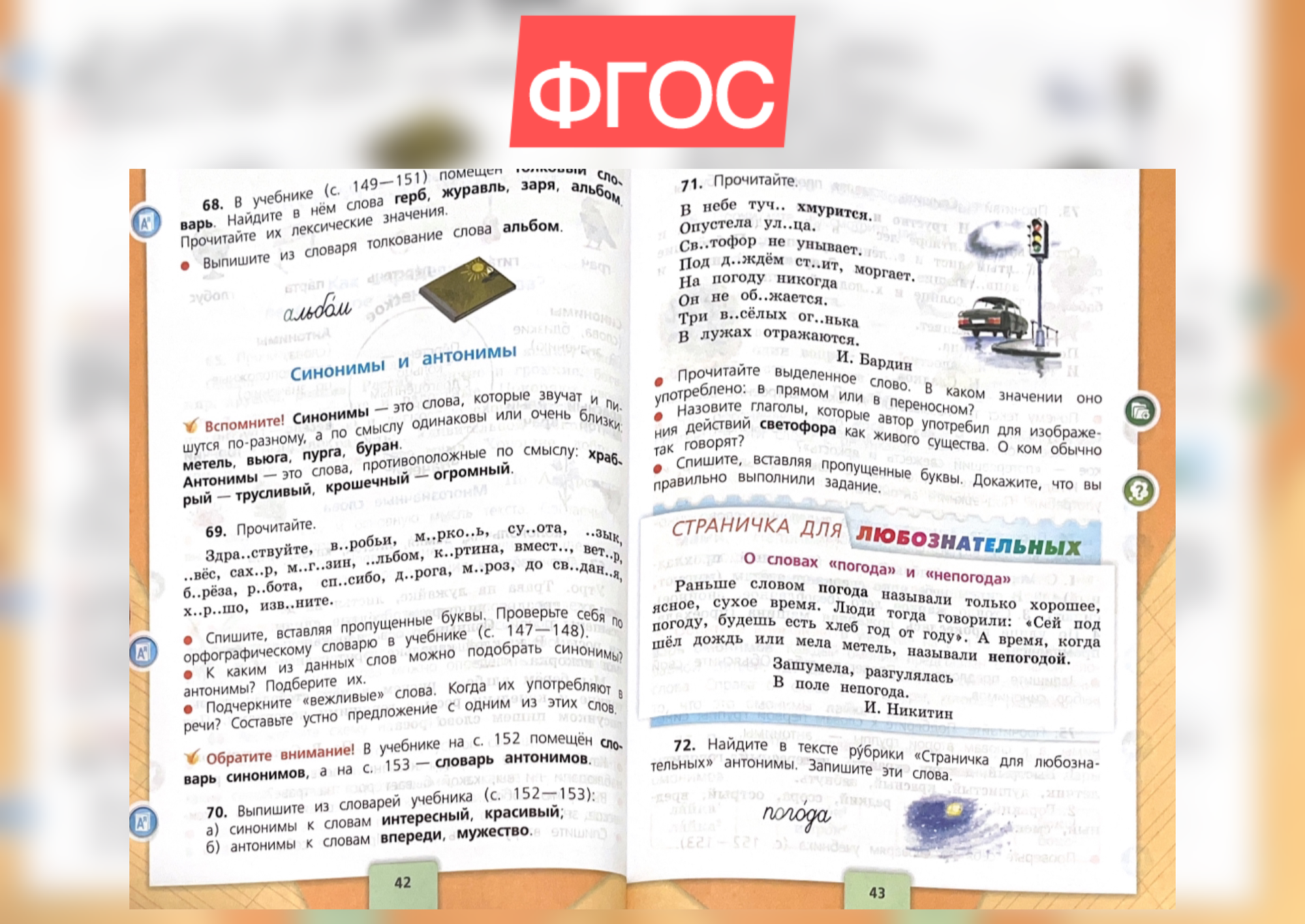 Присутствуют разноцветные иллюстрации, схемы, правила и словарные слова.