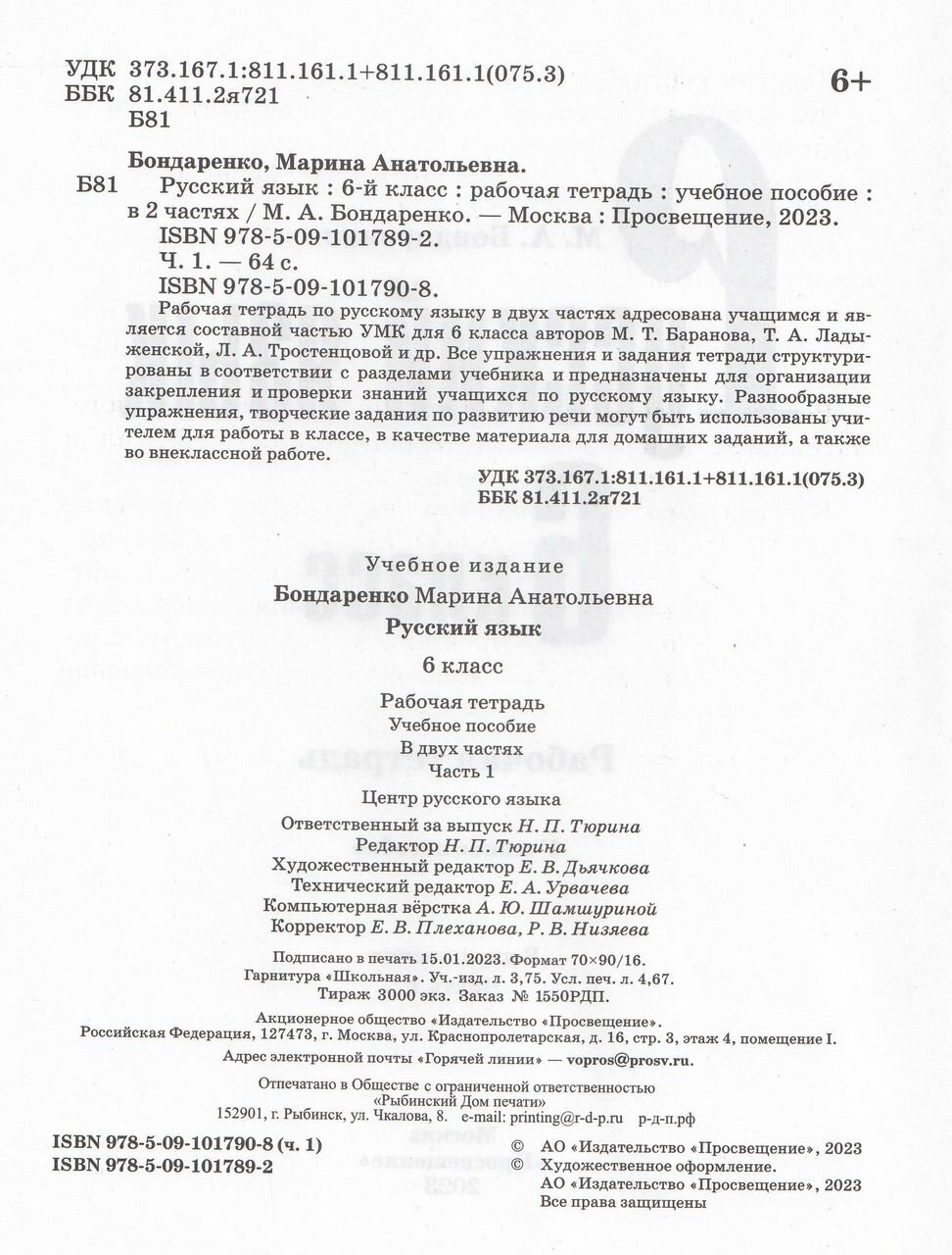 Русский язык. 6 класс. Рабочая тетрадь. В двух частях. Часть 1 (Марина Анатольевна Бондаренко); Просвещение, 2025