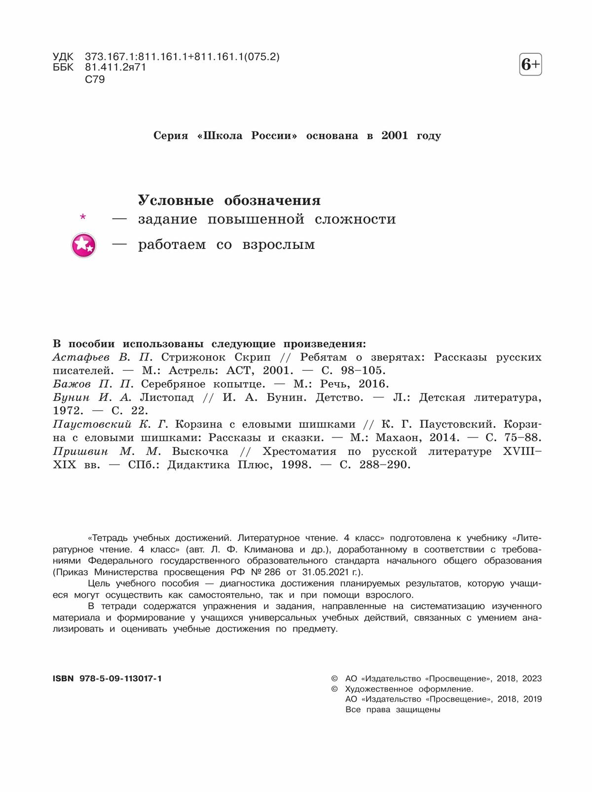 "Тетрадь учебных достижений. Литературное чтение. 4 класс" подготовлена к учебнику "Литературное чтение. 4 класс" (авт. Л. Ф. Климанова и др.), доработанному в соответствии с требованиями Федерального государственного образовательного стандарта начального общего образования (Приказ Министерства просвещения РФ №286 от 31.05.2021 г.).