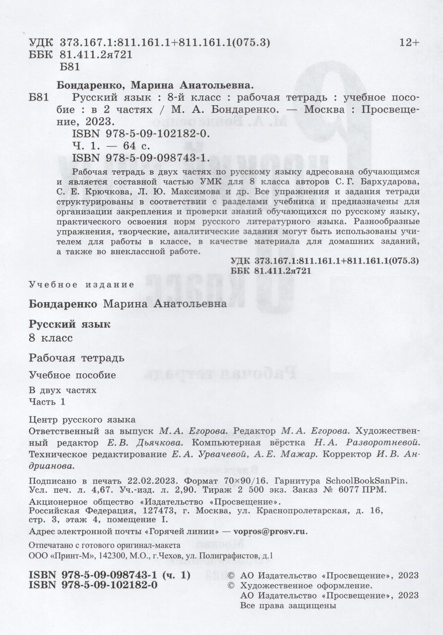 Русский язык. 8 класс. Рабочая тетрадь. В двух частях. Часть 1 (Марина Анатольевна Бондаренко); Просвещение, 2026