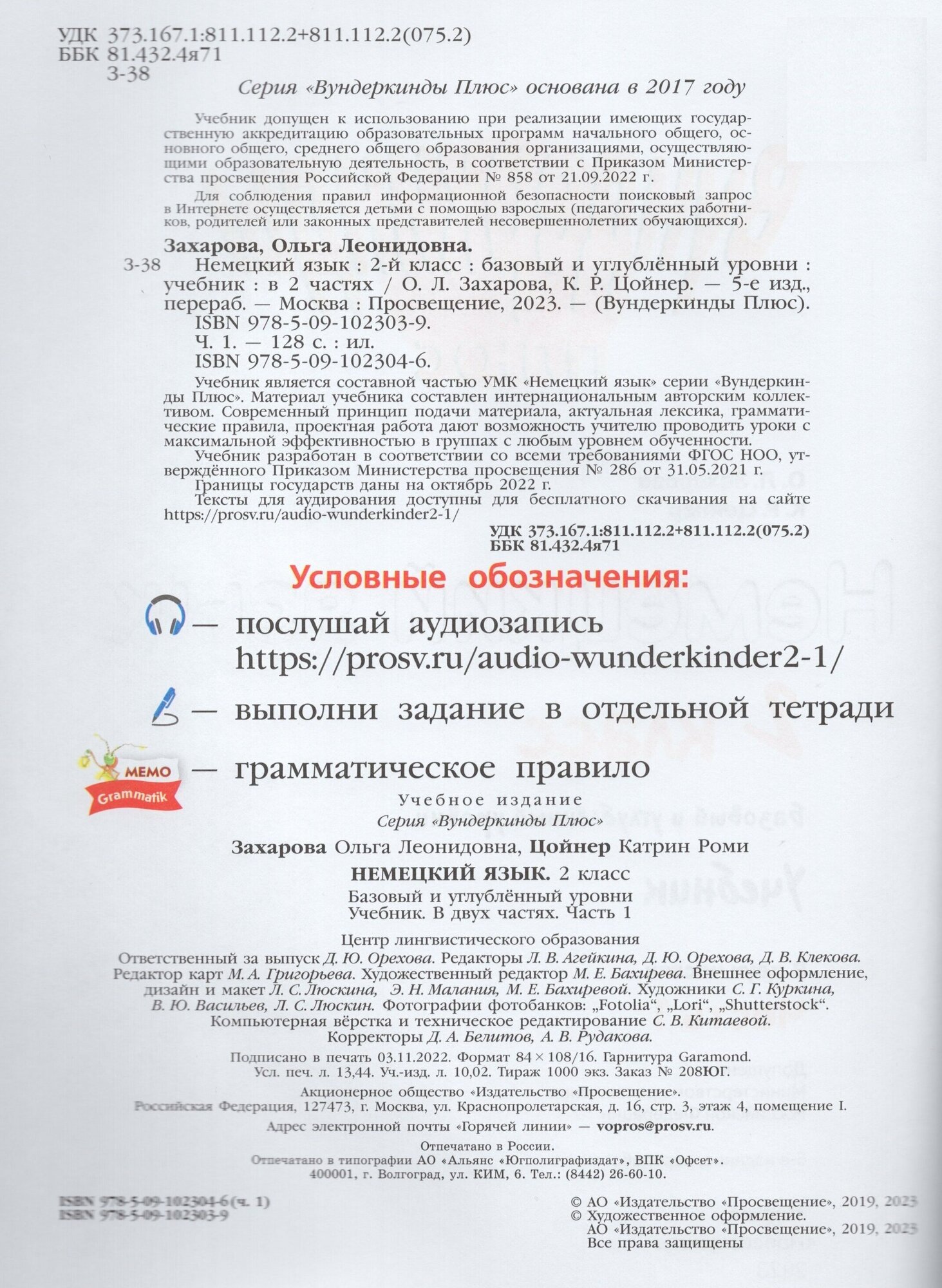 Deutsch. Немецкий язык. 2 класс. Базовый и углублённый уровни. Учебник. В двух частях. Часть 1 (Захарова Ольга Леонидовна,Цойнер Катрин Роми); Просвещение, 2023