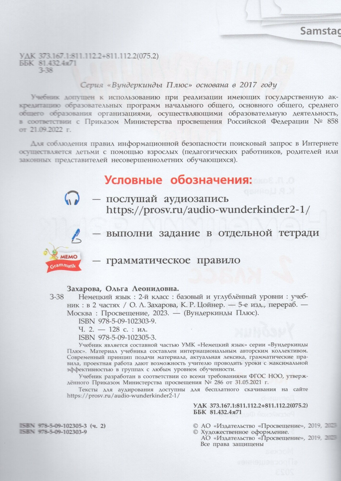 Учебник соответсвует ФГОС 2021 г. Учебник является составной частью УМК «Немецкий язык» серии «Вундеркинды Плюс». Материал учебника составлен интернациональным авторским коллективом. Современный принцип подачи материала, актуальная лексика, грамматические правила, проектная работа дают возможность учителю проводить уроки с максимальной эффективностью в группах с любым уровнем обученности. Учебник разработан в соответствии со всеми требованиями ФГОС НОО, утвержденного приказом Министерства просвещения № 286 от 31.05.2021 г.