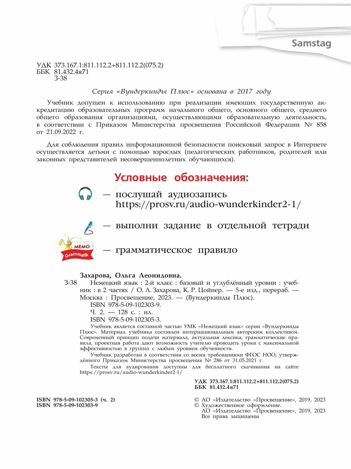 Deutsch. Немецкий язык. 2 класс. Базовый и углубленный уровни. Учебник. В двух частях. Часть 2 (Цойнер Катрин Роми, Захарова Ольга Леонидовна); Просвещение, 2023